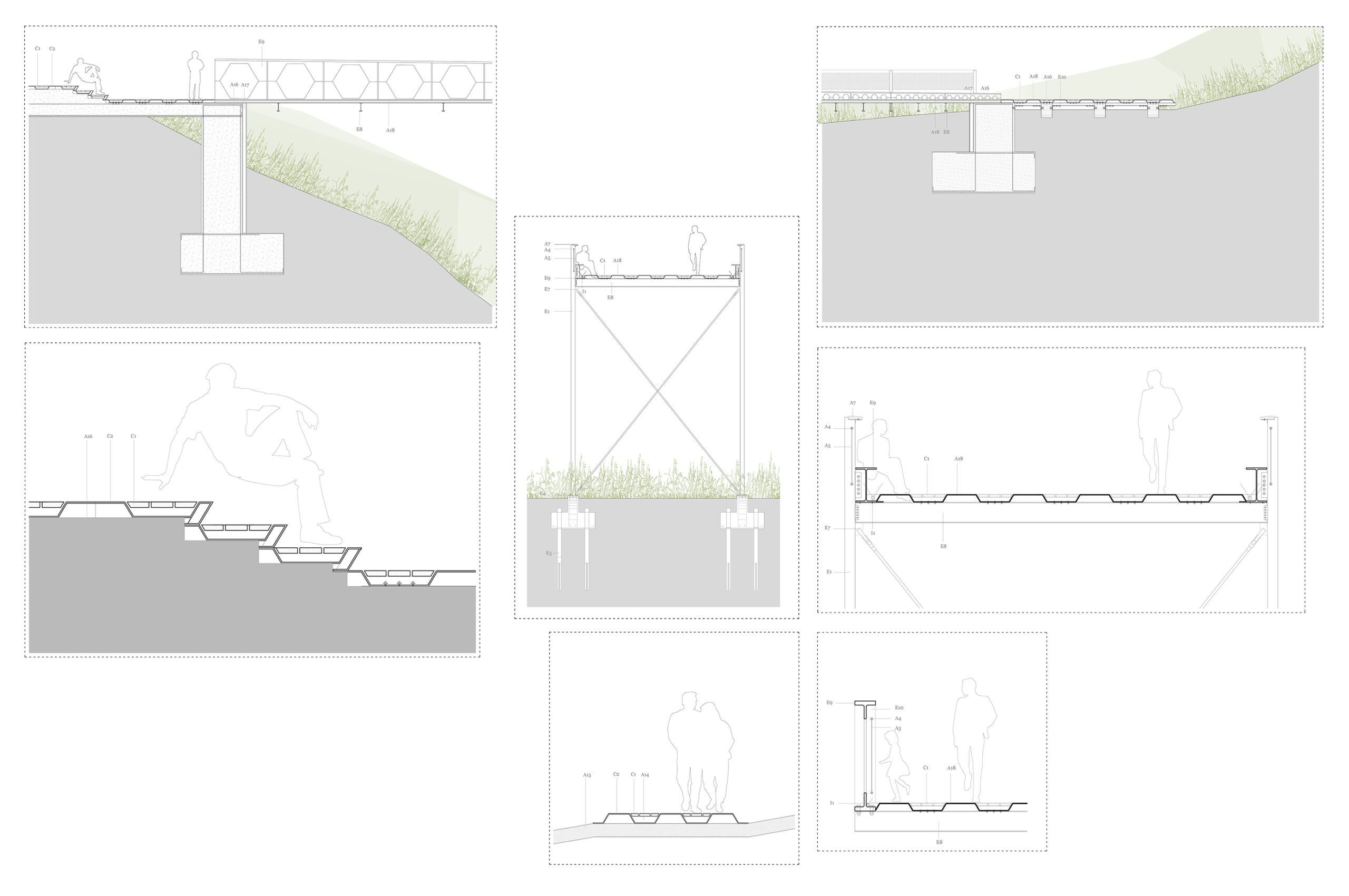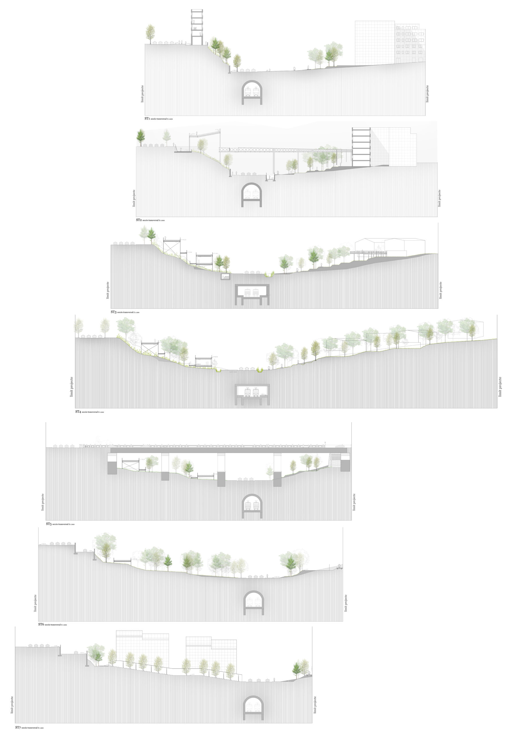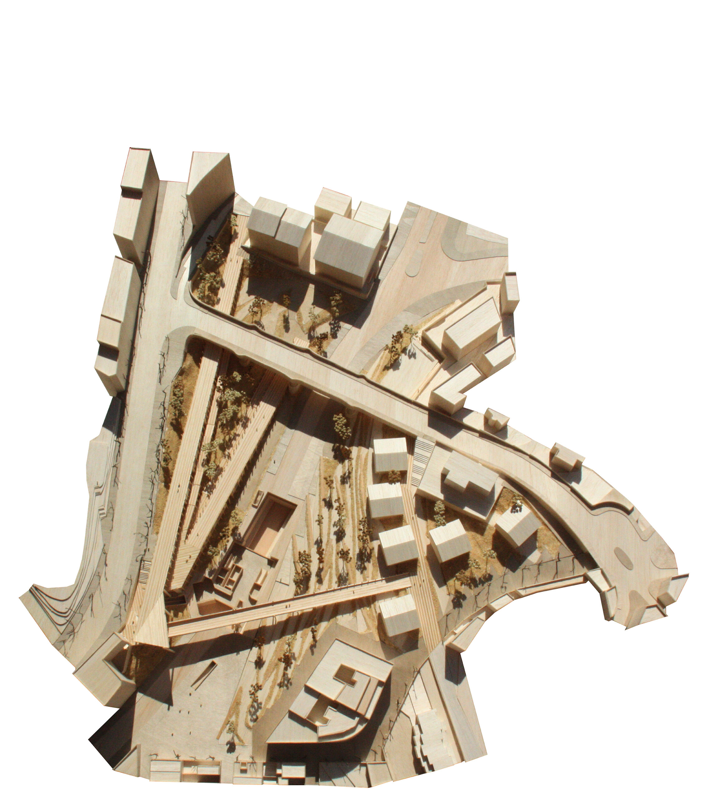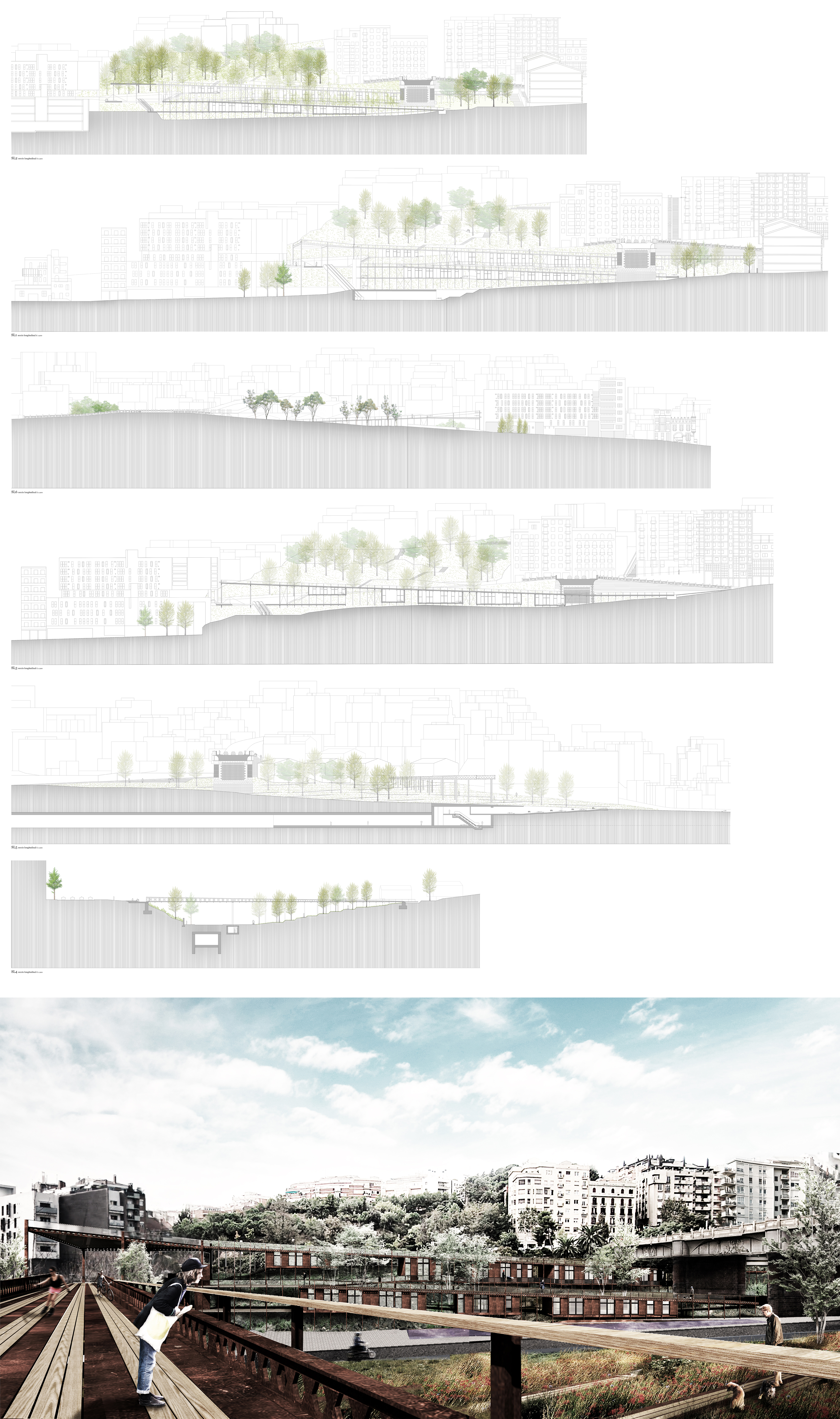 El proyecto es un valle y un puente. Una red de caminos que gradualmente van del sistema 1 elevado, puente, sistema 1-2 en los estribos, sistema 2 tocando el suelo. El espacio “entre” deja pasar el agua y crecer la vegetación, el recorrido desde el esfuerzo se solapa con la actividad como linde donde pueda darse la vida pública, talleres, espacios de trabajo y creatividad, dando oportunidad a nuevas formas de producir y un programa abierto.