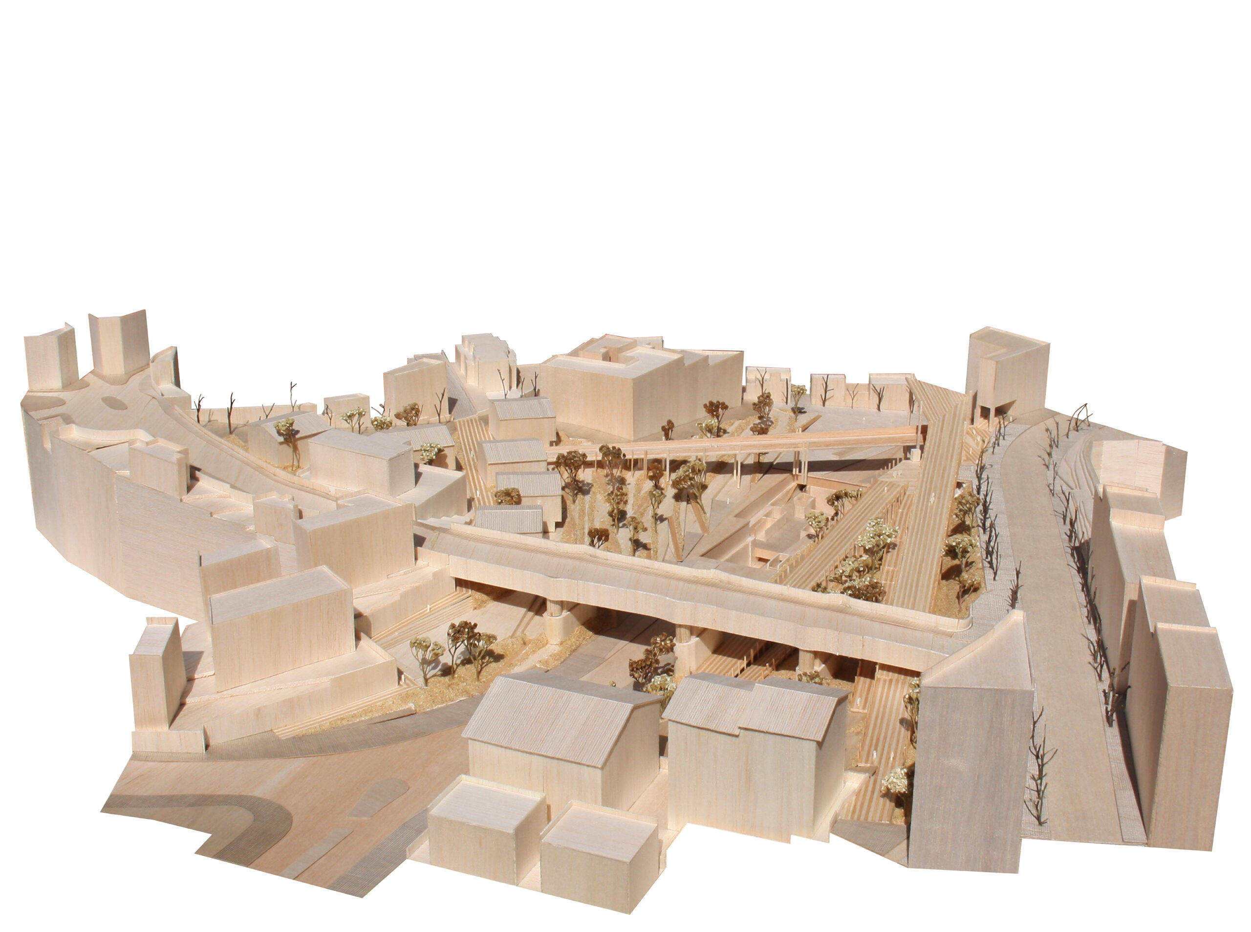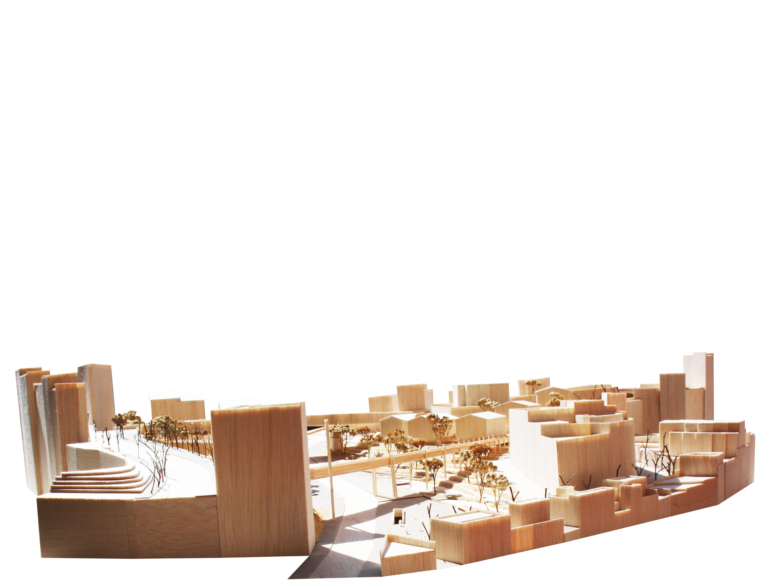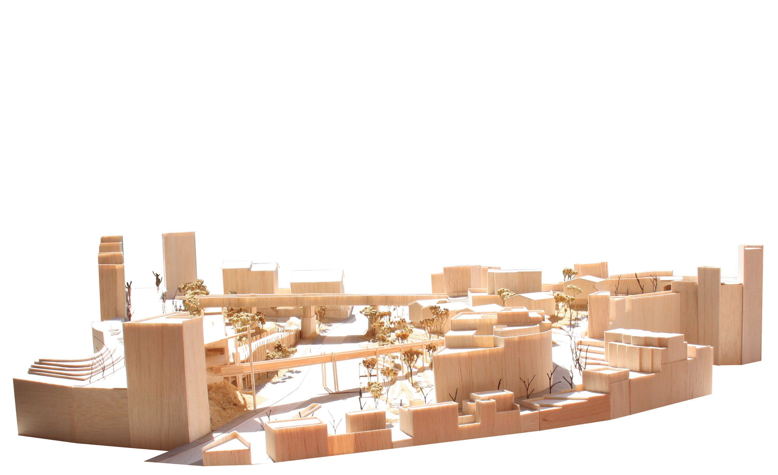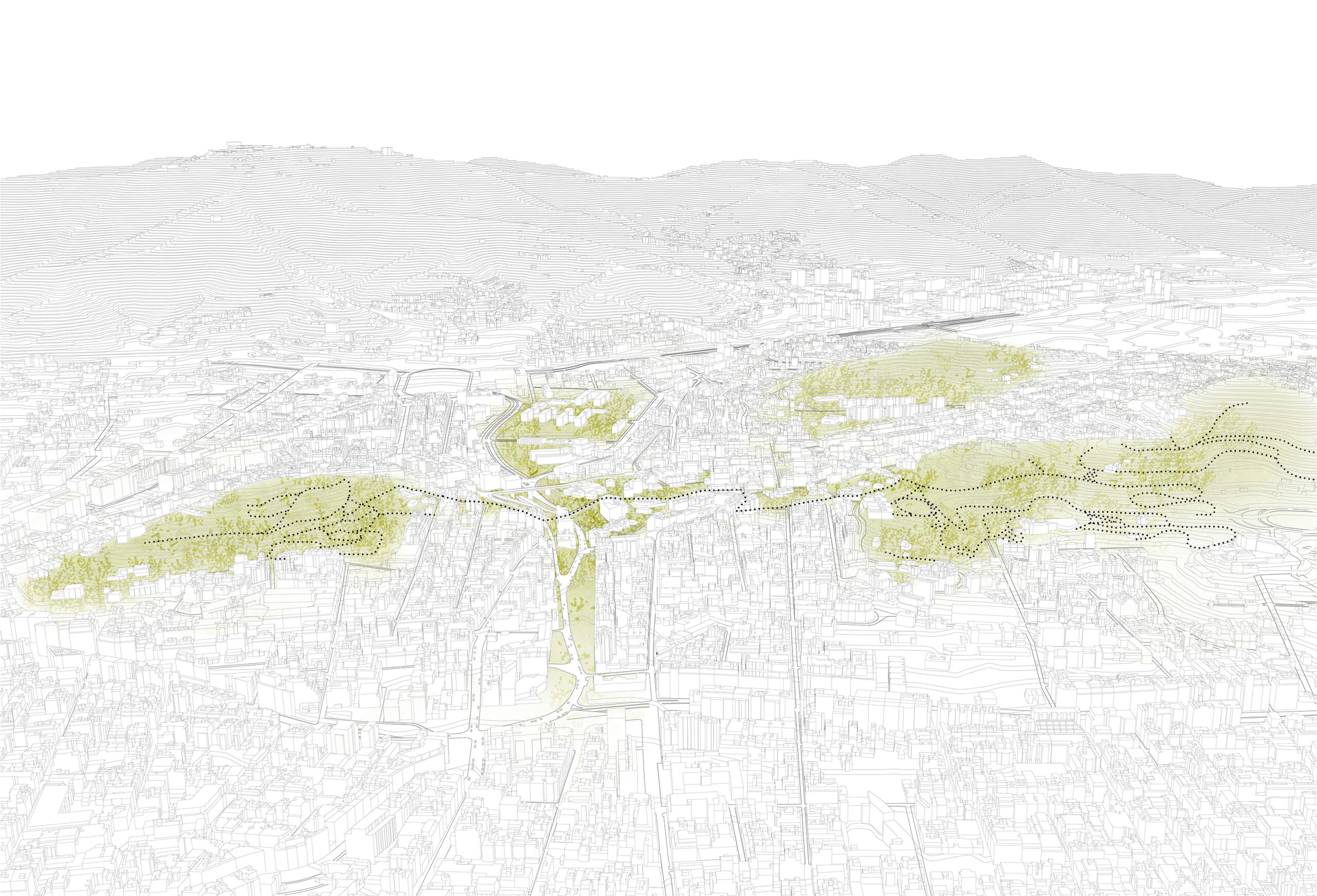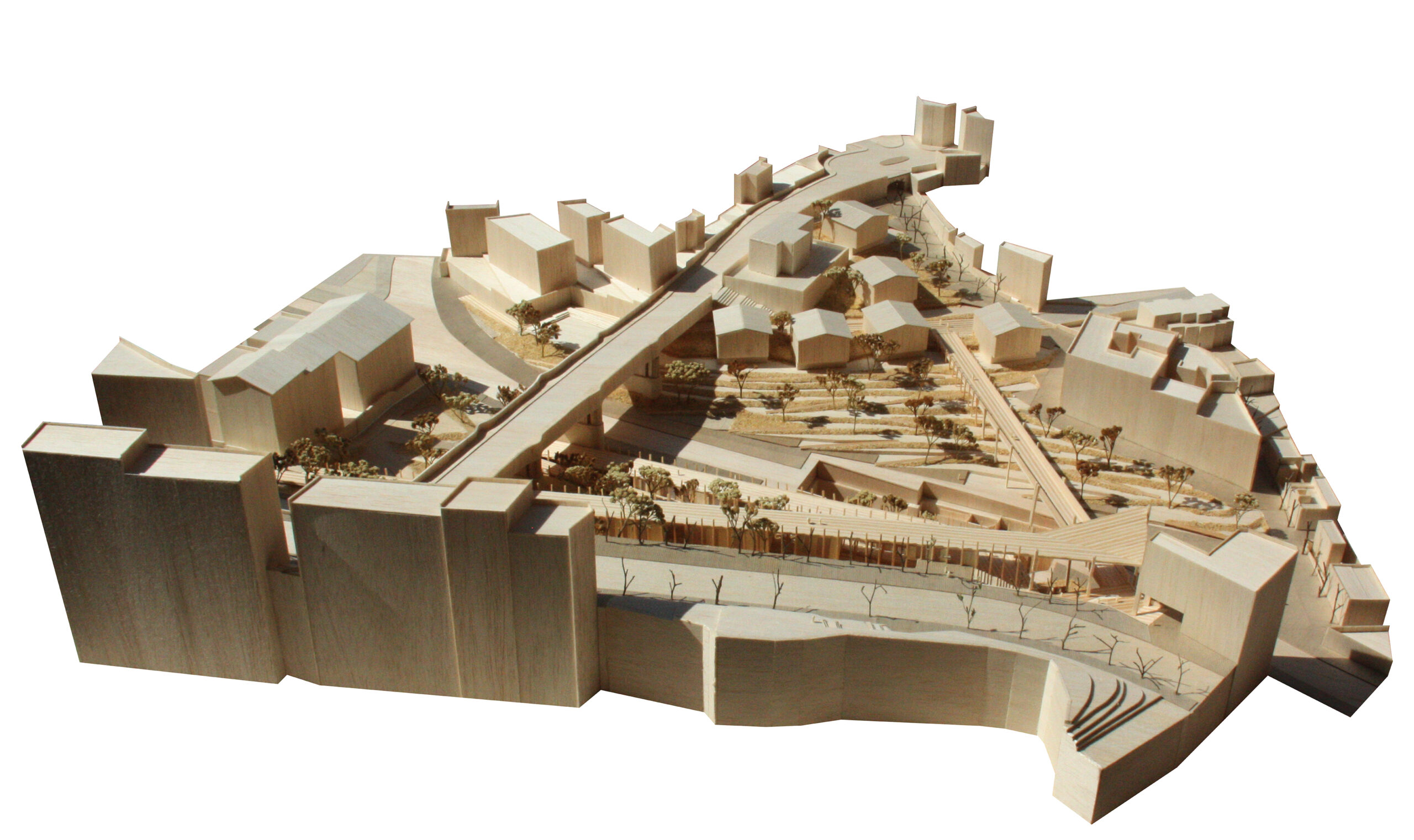 El proyecto es un valle y un puente. Una red de caminos que gradualmente van del sistema 1 elevado, puente, sistema 1-2 en los estribos, sistema 2 tocando el suelo. El espacio “entre” deja pasar el agua y crecer la vegetación, el recorrido desde el esfuerzo se solapa con la actividad como linde donde pueda darse la vida pública, talleres, espacios de trabajo y creatividad, dando oportunidad a nuevas formas de producir y un programa abierto.