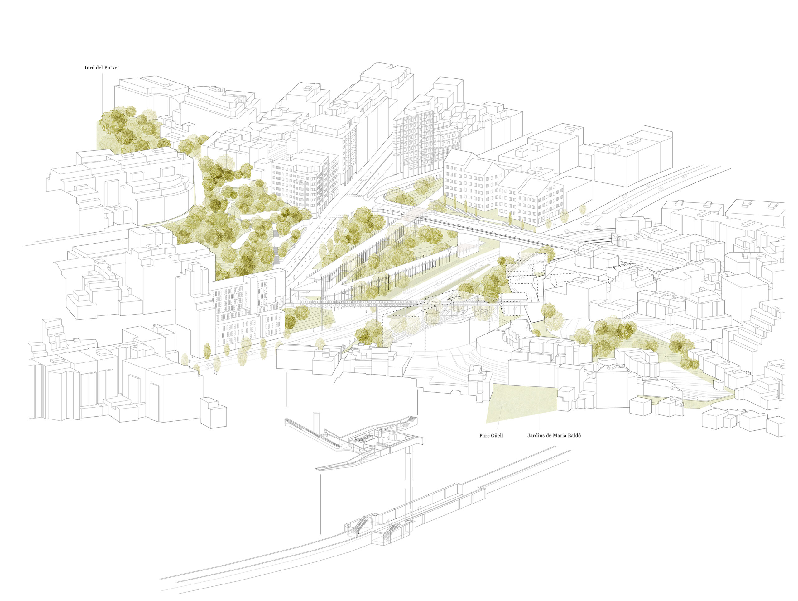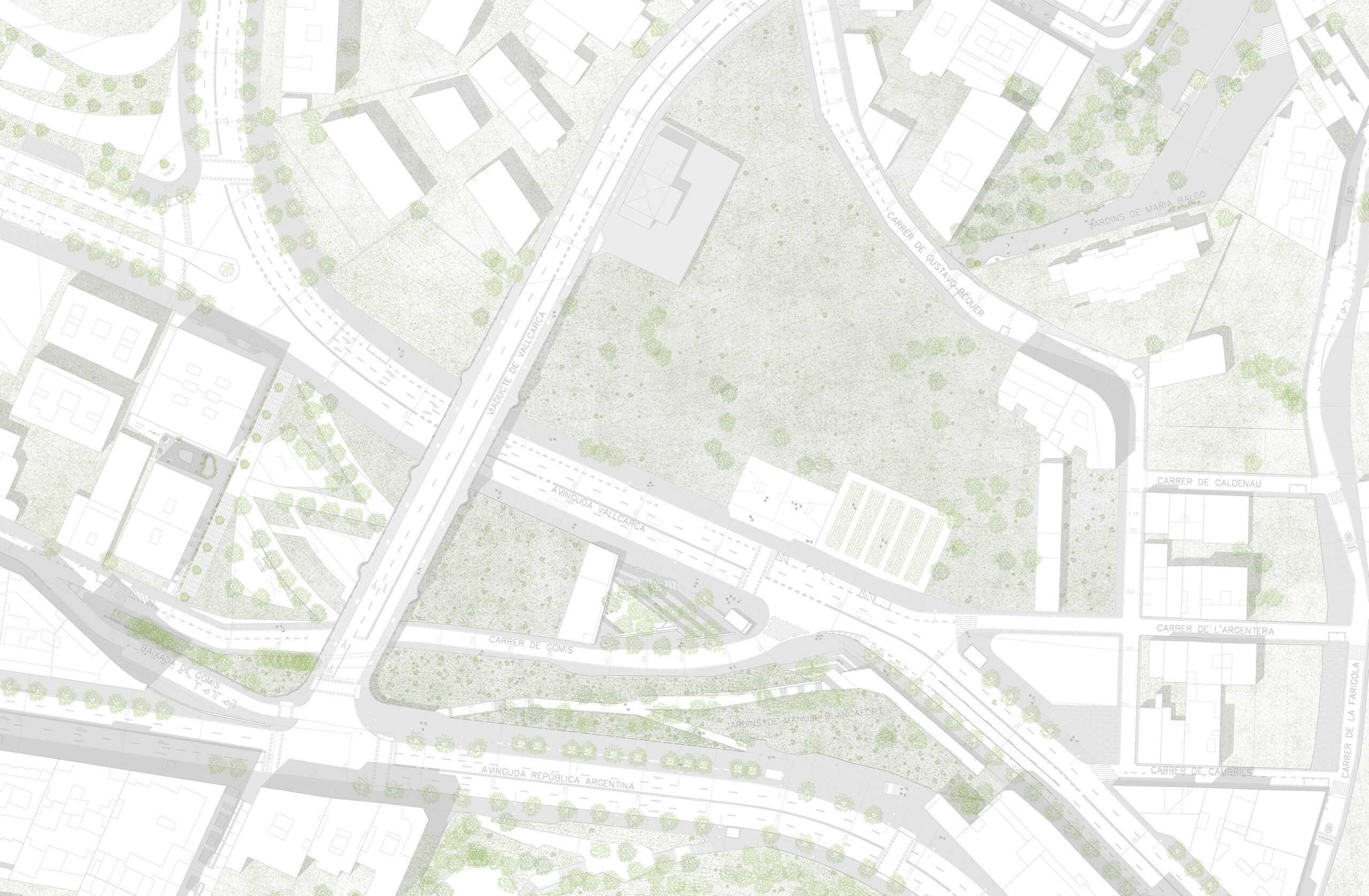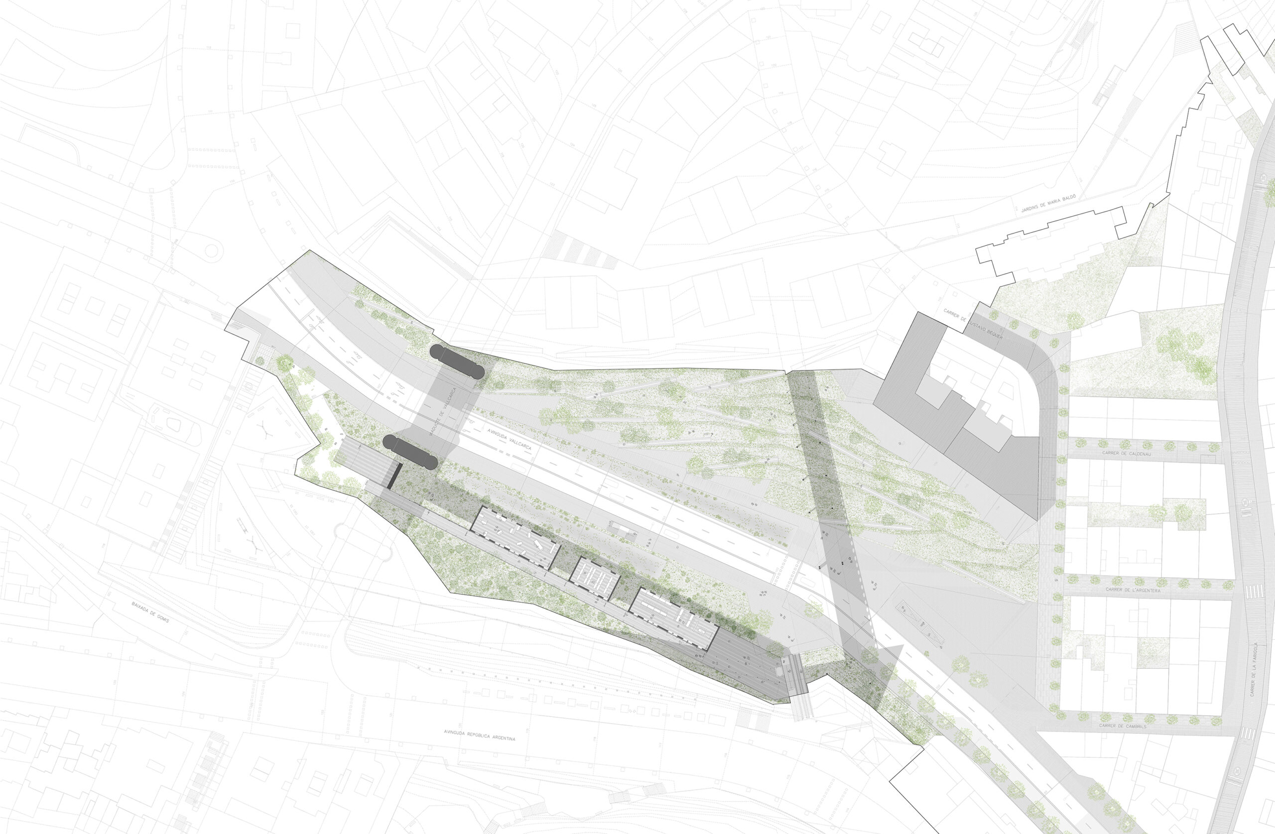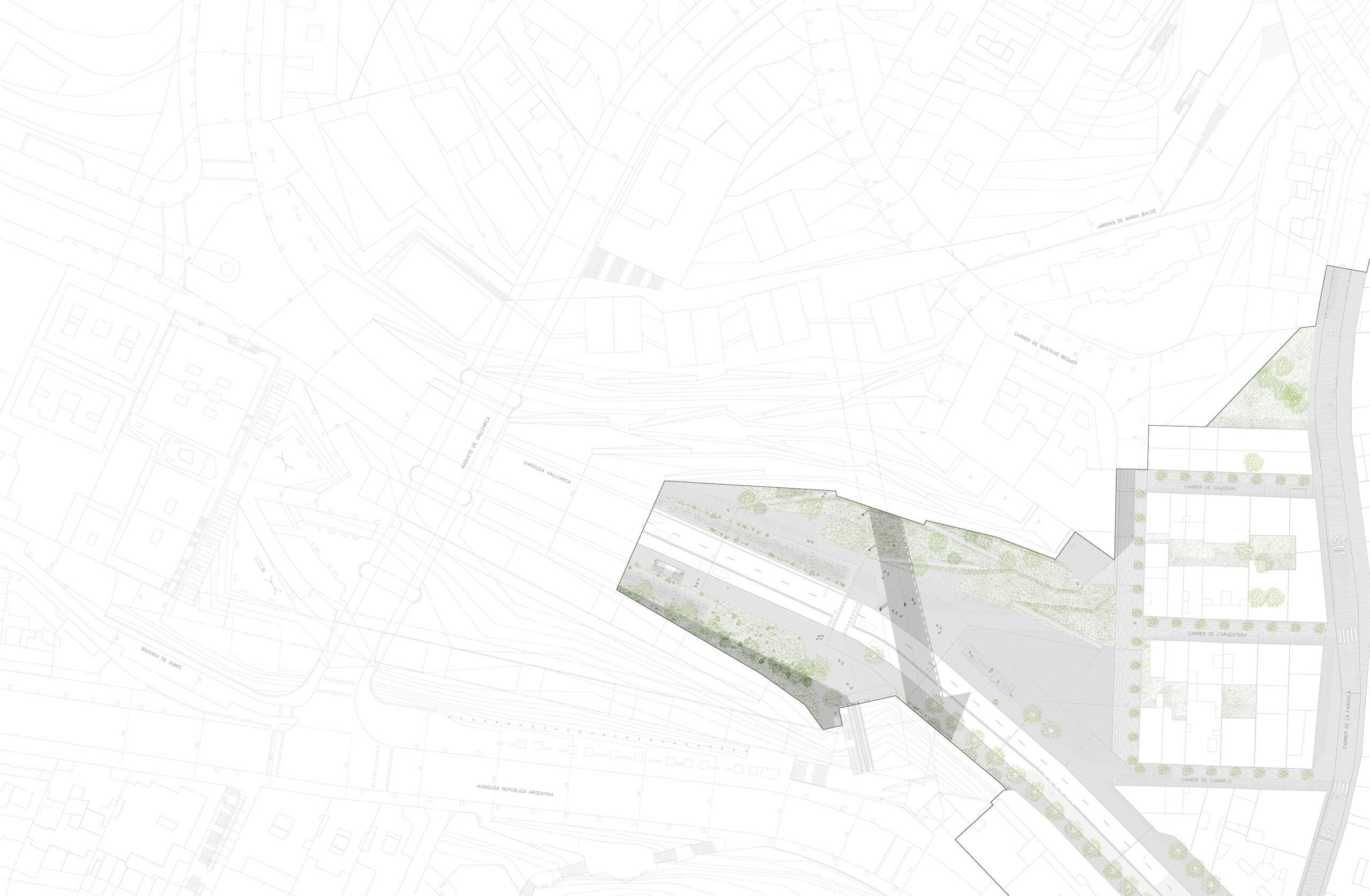 La infraestructura metro se abre al exterior en camino y un movimiento de tierras meticuloso con el existente se equilibra en extraído y añadido entre las dos vertientes del valle, construyendo lo mínimo (un solo muro de contención). El coche pierde protagonismo, reordenándolo, eliminando un tramo en calle Gomis y pacificando, priorizando el caminante.