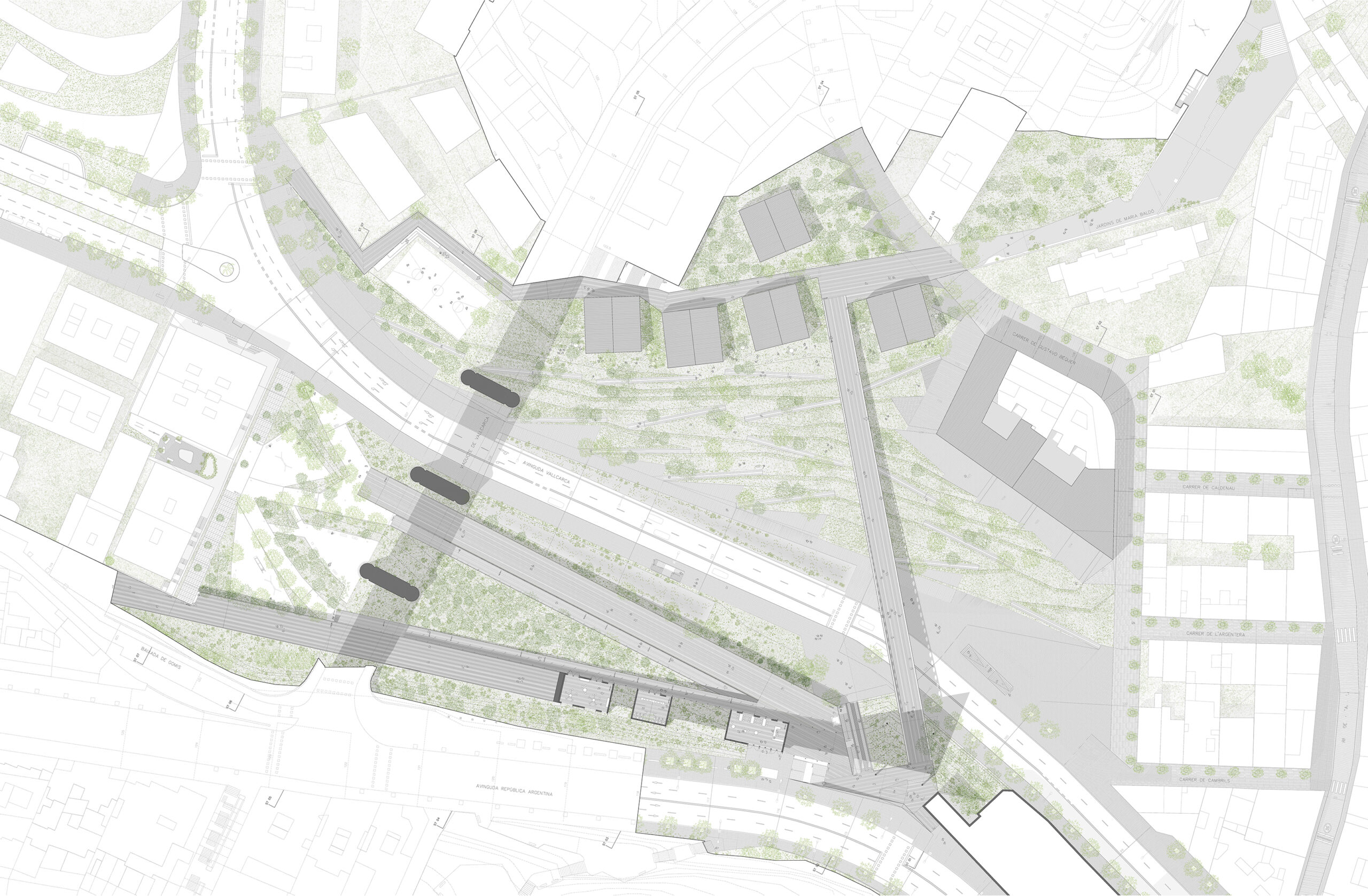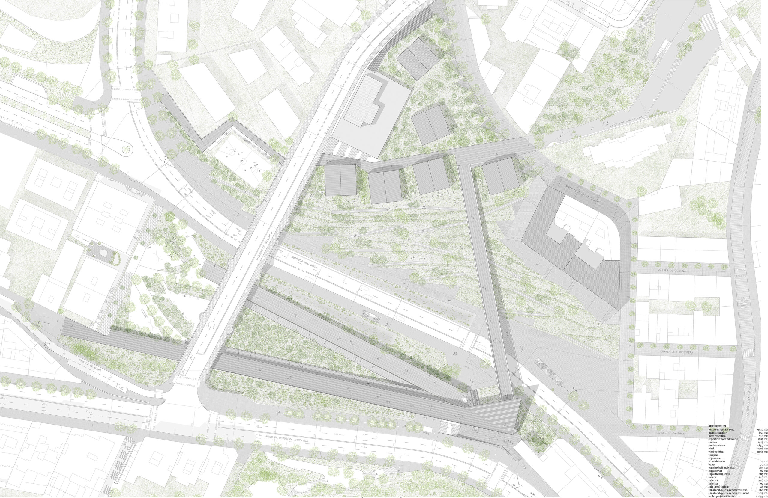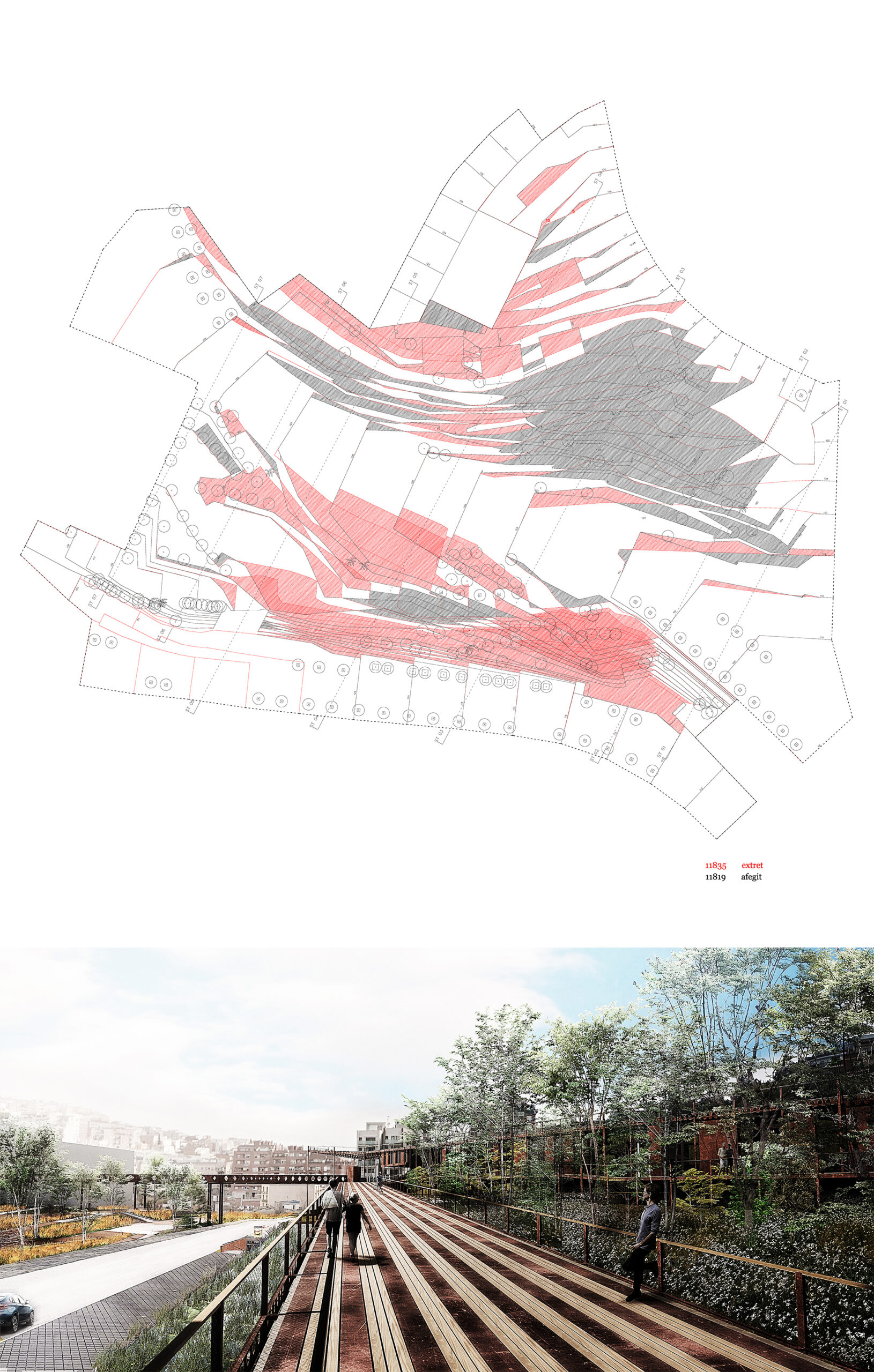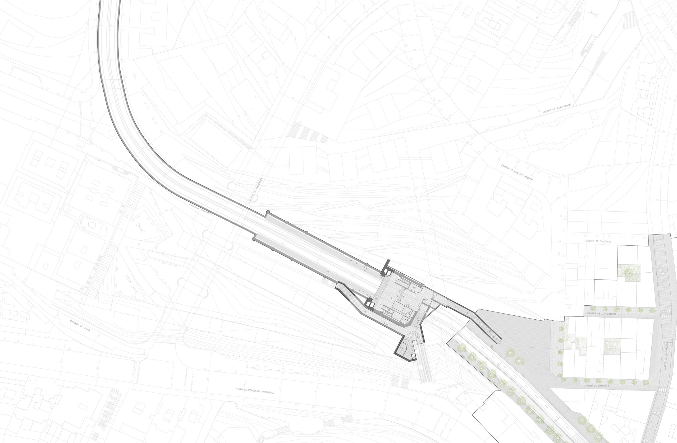 La infraestructura metro se abre al exterior en camino y un movimiento de tierras meticuloso con el existente se equilibra en extraído y añadido entre las dos vertientes del valle, construyendo lo mínimo (un solo muro de contención). El coche pierde protagonismo, reordenándolo, eliminando un tramo en calle Gomis y pacificando, priorizando el caminante.