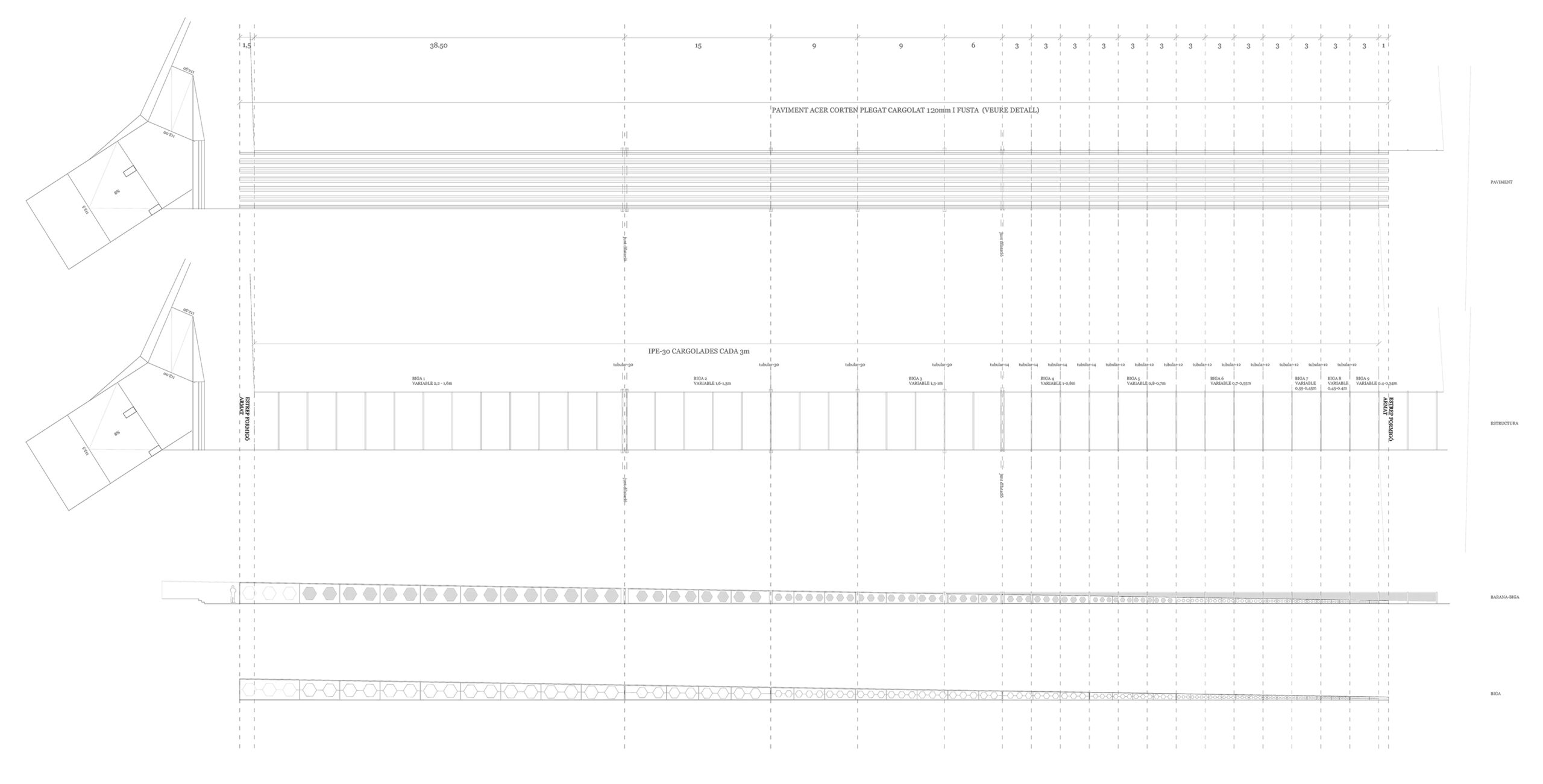 El material acero corten, en una estructura-sistema muy ligero (en contraste con el imponente viaducto de Vallcarca) de perfiles tubulares de sólo 12 cm cada 3 m, bigas continuas y espacios interiores independientes debajo con fachadas de paneles auto portantes. El pavimento es el mismo en interior y exterior en continuidad igual a las instalaciones, vistas, que parten del punto central y se distribuyen. Se opta por un sistema de pozos canadienses y un apoyo de radiadores para los puntos máximos en invierno. El agua es recogida por los caminos previniendo la erosión del terreno, junto con las aguas grises generadas, en dos puntos húmedos en cada vertiente, con tratamiento de fitodepuración y reutilizada para riego de la zona.