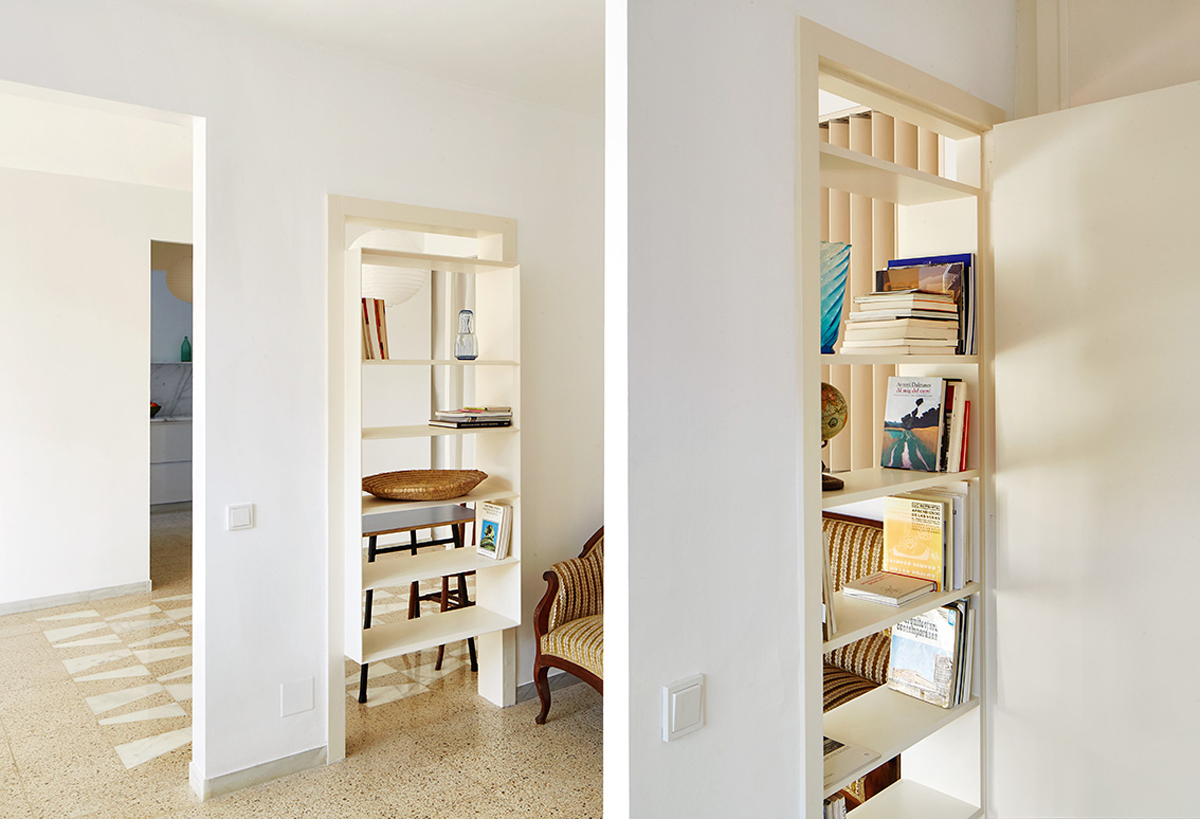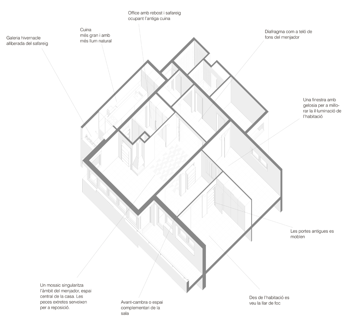 La reforma vol sumar, reconeix els elements que han configurat l’anterior distribució, no els nega ni els elimina, se’ls apropia, reaprofita allò existent per integrar-los a la nova i posar-los en valor. Així, els obsolets passos de porta, requalificats com a nou mobiliari, adopten el rol de prestatgeries, biblioteques o armaris per a productes de neteja; les fulles de porta esdevenen finestres o porticons.