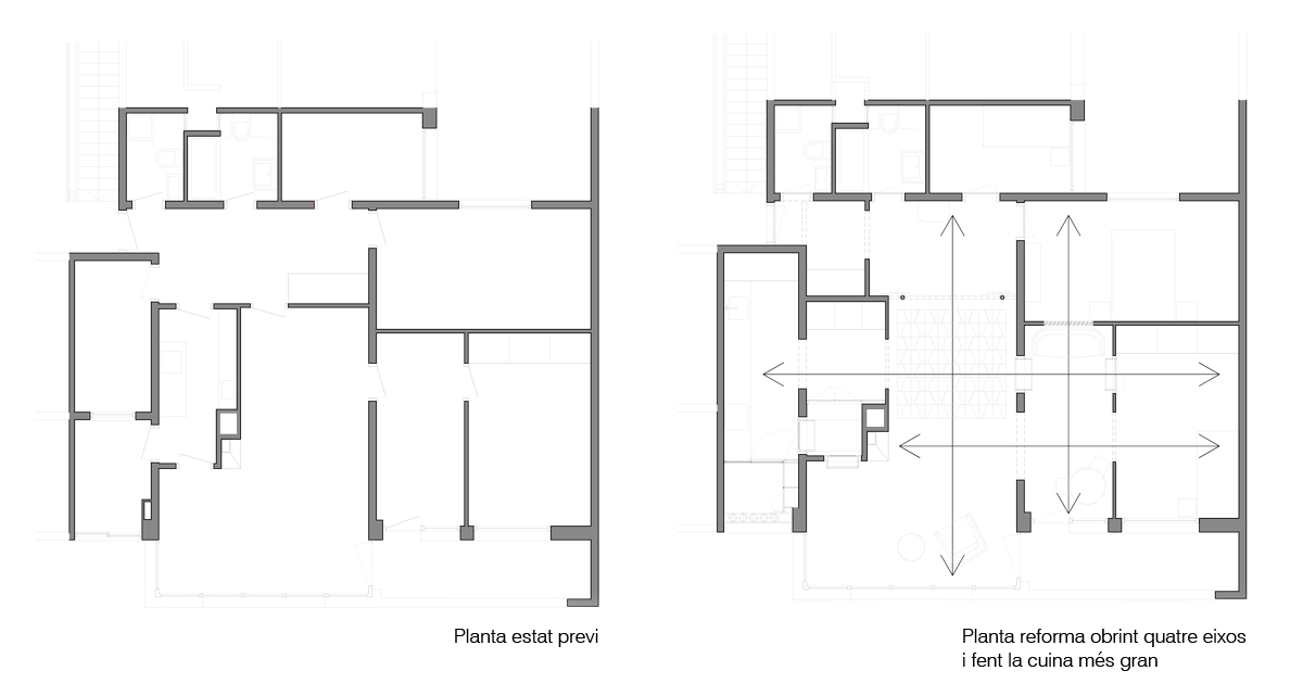 Sis noves obertures travessen els murs de càrrega i modifiquen la distribució de l’habitatge pautada per la lògica estructural de l’edifici. Reorganitzen les sales per tal d’afavorir l’entrada de llum natural cap a les peces més interiors i millorar-ne la seva qualitat espacial. Els nous eixos visuals generats desjerarquitzen la relació entre les estances, més diàfanes i permeables, alhora que accentuen la seva continuïtat a través dels nous diafragmes. D’aquesta manera, s’emmarquen i es dignifiquen cadascuna de les escenes quotidianes de la casa: el cuinar, el menjar, el dormir i l’estar.