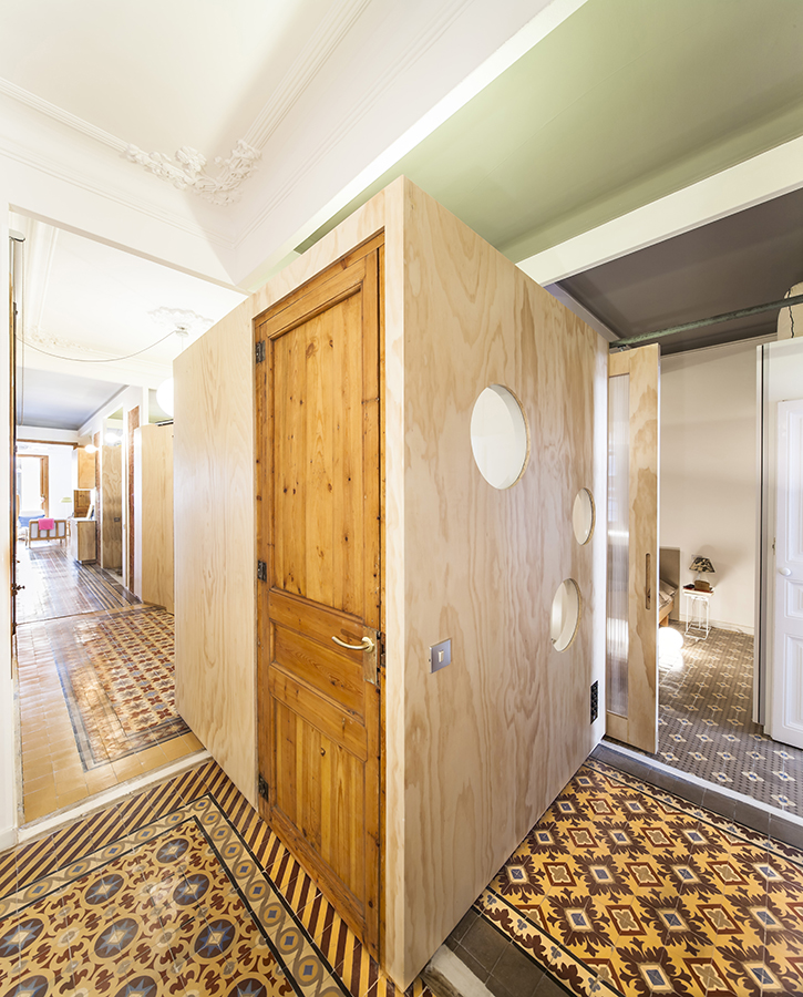 Este paisaje también nos da una cierta tranquilidad en no hipotecar programáticamente el piso, y nos permite el lujo de no saber como vamos a vivir en los próximos 50 años. Un soporte de indefinición forzada para ser capaz de absorber el máximo de actividades variables, como a día de hoy son la producción de guiones, de tejidos, de ilustraciones, de comidas, de música, de dibujos…. Actividades imposibles de aislar, y que se encadenan de manera natural las unas con las otras. Una fábrica doméstica de creación.