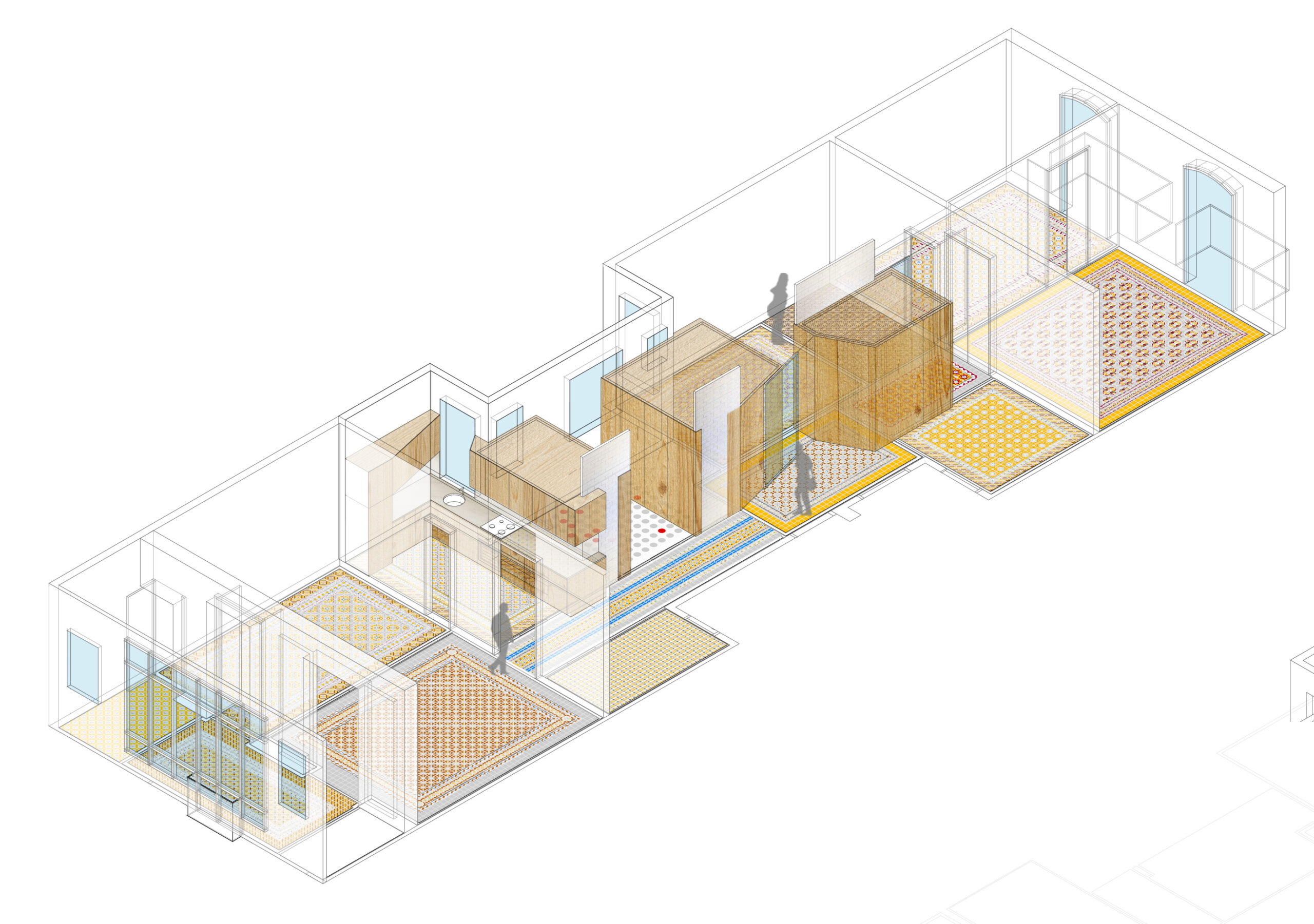Al mismo tiempo, la nueva organización enfatiza la continuidad espacial de los pavimentos y de los falsos techos, como elemento de soporte básico de este paisaje, solo delimitado por las trazas de las antiguas habitaciones.