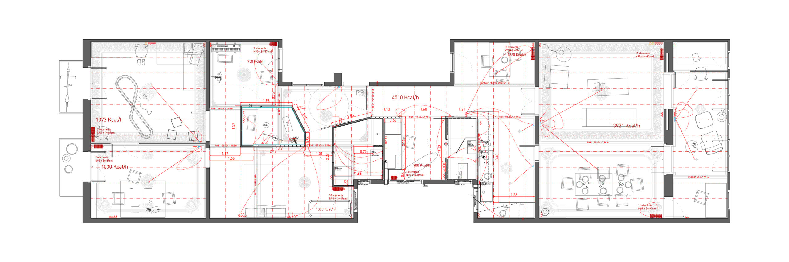 La parte más conflictiva, de este piso del ensanche de Barcelona, desde el punto de vista lumínico y de organización es claramente su centro. Las zonas en contacto con los patios interiores y el núcleo de comunicación vertical. Las partes que están en contacto con las fachadas tienen ya las condiciones ideales para funcionar por sí mismas, y por lo tanto no hay que hacer casi nada.