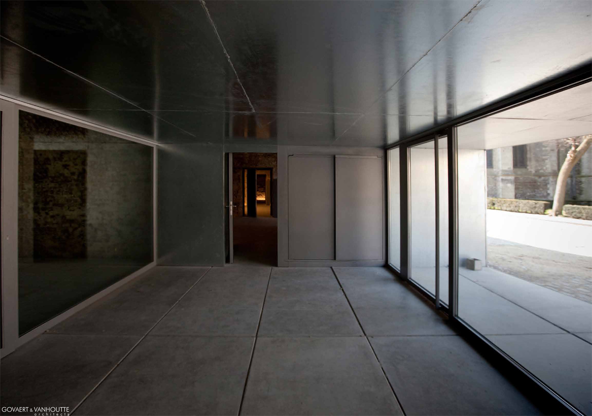 The restoration and reconversion of 2013 concerns a fluid circulation between a conference room, exhibition spaces, a restaurant and an information desk with sanitary facilities inside this massive edifice. In a moderate and at the same time strong way, the present historical traces have been kept as accurate as possible. Straightforward contemporary, but extremely delicately and lightly designed additions such as (pivoting) doors and glass fronts enhance in one respect the soft formal language of the underground volumes, but also contrast with the heaviness of the stacked stone mass. As well as the elongated light fixtures, the indirect lighting alongside the seemingly floating concrete floor, emphasizes the depth of the subterrains. The entrance not only unlocks three of the five vaulted venues, but also generates a transition between the cobblestones in the street and the smooth polished concrete floor by means of concrete pavement tiles. As a gentle passage between present and past.