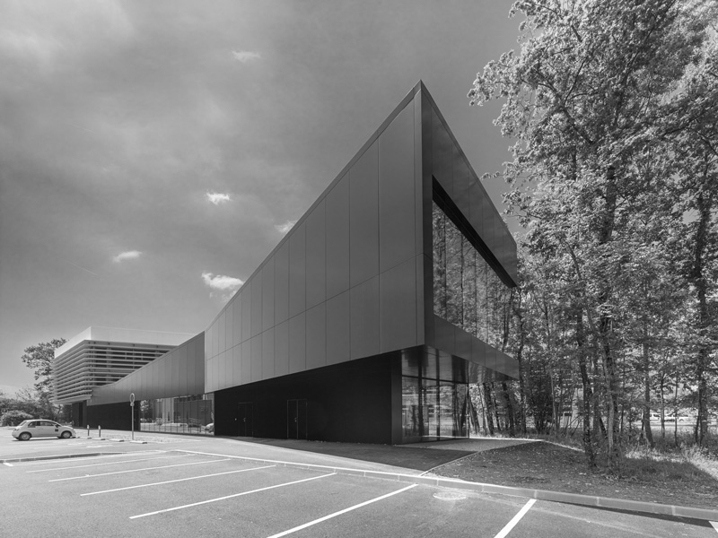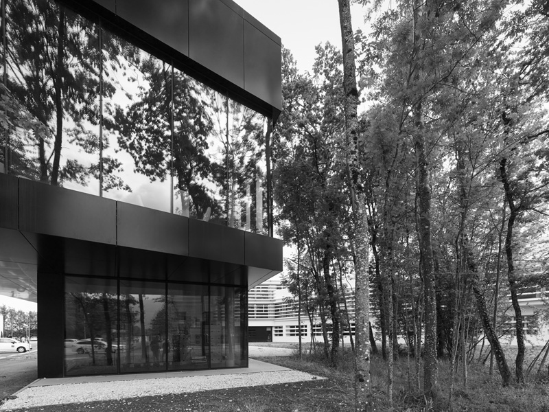 El edificio está acabado en hormigón aligerado (GRC) de color blanco roto con lamas que potencian la horizontalidad del conjunto, contrapuestas a un ala en alucobond negro.