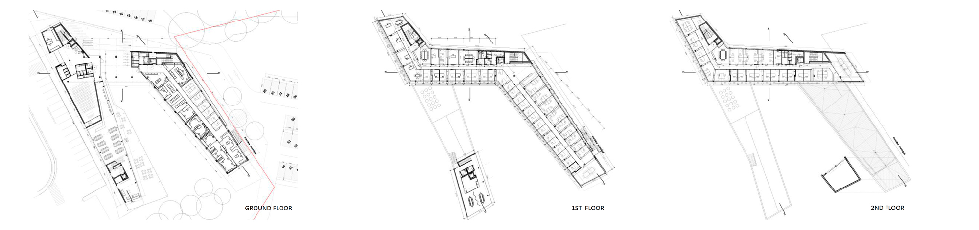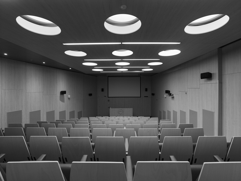 El proyecto interpreta el anagrama del CERN (círculos y partículas en todas las direcciones del espacio) que nos inspiró generar un vacío central (metáfora del vacío de la materia) en torno al que establecer las distintas alas. Los físicos trabajan para descubrir sus leyes internas, pero los arquitectos, también, ya que trabajamos tanto con los elementos construidos, como con el vacío (el espacio resultante)… Y con la luz… Los silencios, en música, son tan importantes como los sonidos… No hay que olvidar que, si la música es aire que suena, la arquitectura es el aire en que vivimos. Deseábamos, además, reinterpretar la materia desde la aleatoriedad. La arquitectura es, siempre, juego y desafío.