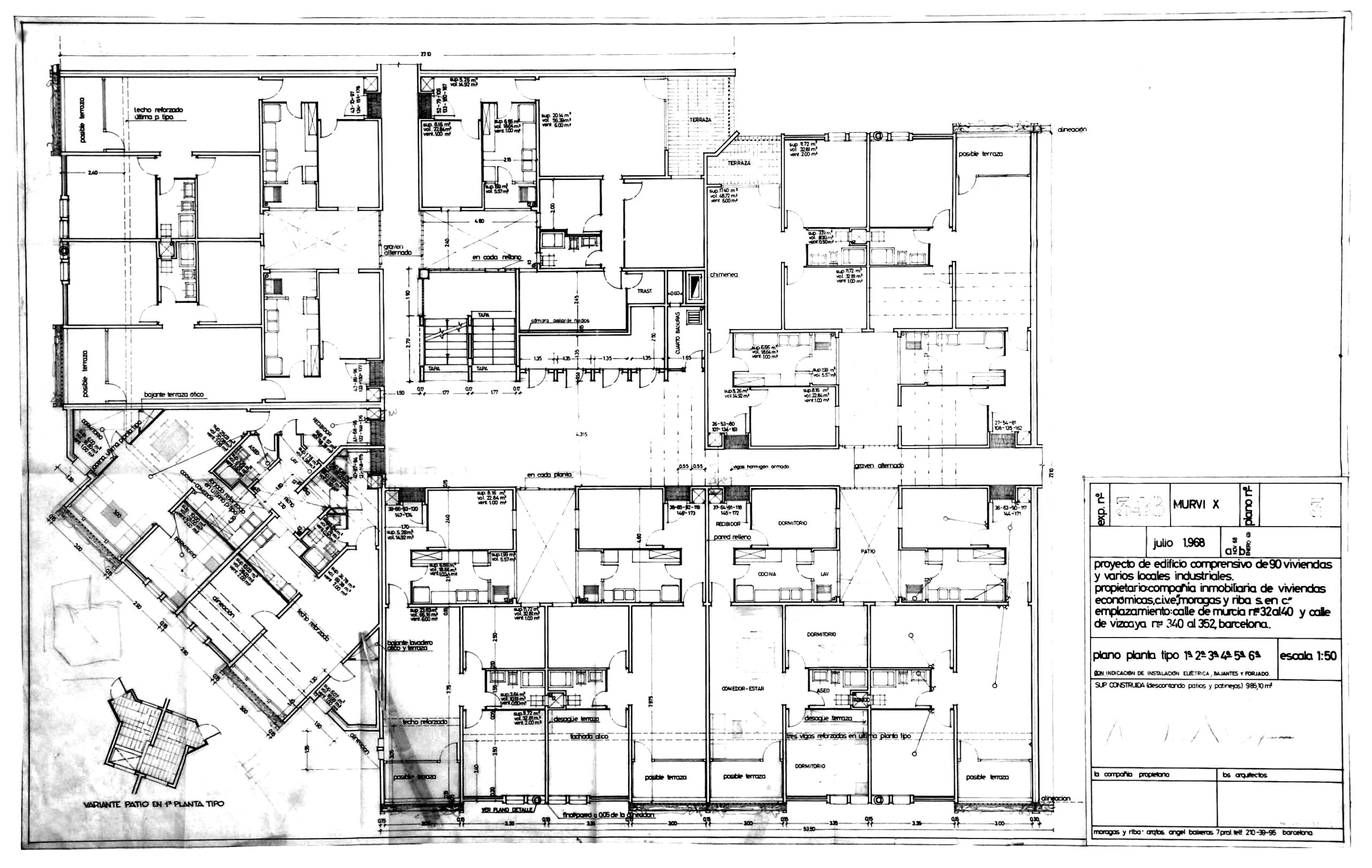 Las viviendas en la calle Biscaia (1968-72) son un buen ejemplo de la última arquitectura residencial de Antoni de Moragas y resumen buena parte de los temas e intereses principales del arquitecto. El proyecto consiste en un edificio en esquina de 22 metros de profundidad y 8 plantas de altura, resuelto con una estructura de muros de carga que descansan sobre pórticos de hormigón armado. Como es recurrente en toda su arquitectura residencial, un sólo núcleo de circulaciones y un gran vestíbulo de acceso resuelven las noventa viviendas del conjunto. Su tipología residencial responde a una variante un poco desfigurada de su habitual esquema de piezas o salas encadenadas, enfiladas por un corredor de acceso; una tipología que tiene en las viviendas de la calle Gomis, Gran Vía o Brusi algunos de sus modelos ejemplares. La fachada se organiza de manera tripartita: el cuerpo central del edificio se levanta sobre un basamento en sombra, con la planta baja reculada, y se remata por un coronamiento de viviendas en el ático. Todos los elementos y soluciones que la configuran contribuyen a reflejar su razón constructiva y funcional: el subrayado de los forjados, los aparejos del ladrillo, los antepechos de cerámica, las soluciones en cremallera de las esquinas o sus connotadas jácenas en voladizo, que como atlantes de hormigón parecen sostener el peso del edificio.