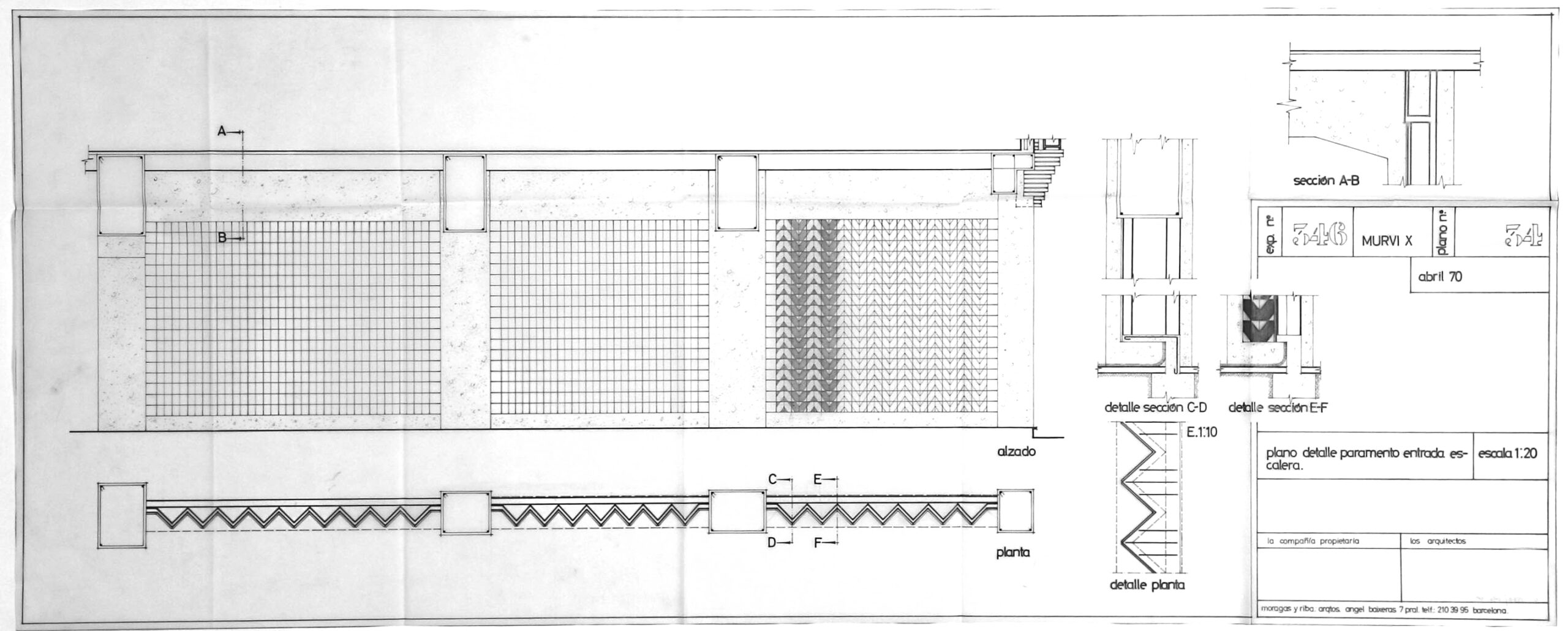 Este vestíbulo muestra de forma inteligible el principal interés de la arquitectura de Moragas: la búsqueda de un espacio regular, prismático, de trazado geométrico pero al mismo tiempo rico y sugerente en sus superficies, saturado de detalle, rebosante. Uno tiene la sensación que, a diferencia de otros arquitectos modernos, Moragasproyecta desde la epidermis de la arquitectura, desde la textura de sus superficies, con una confianza absoluta en las soluciones materiales, en el detalle, y desde allí, va cualificando poco a poco el resto del espacio. De la superficie al volumen, del revestimiento al espacio, del material a la forma. Acostumbrados a esa gran tradición de la arquitectura moderna basada en una confianza absoluta en el espacio: diáfano, fluido, saciado de perspectivas, dobles alturas o promenades discursivas; la arquitectura de Moragas en cambio, aparece sosegada y tenue, poco agitada, representante de esa otra tradición moderna más material, háptica, sensitiva y profunda. Su principal vocación, -su acento-, no está tanto en los recursos espaciales que el proyecto pone en marcha como en el valor de sus detalles, en el trabajo de sus revestimientos, en el material en estado puro. El ojo del visitante no se detiene pues, en las proporciones del espacio o en sus mecanismos formales como en la calidad de sus límites, en la rugosidad de su textura, en sus acabados, en el material, el último responsable a quien Moragas confía la construcción del espacio.
