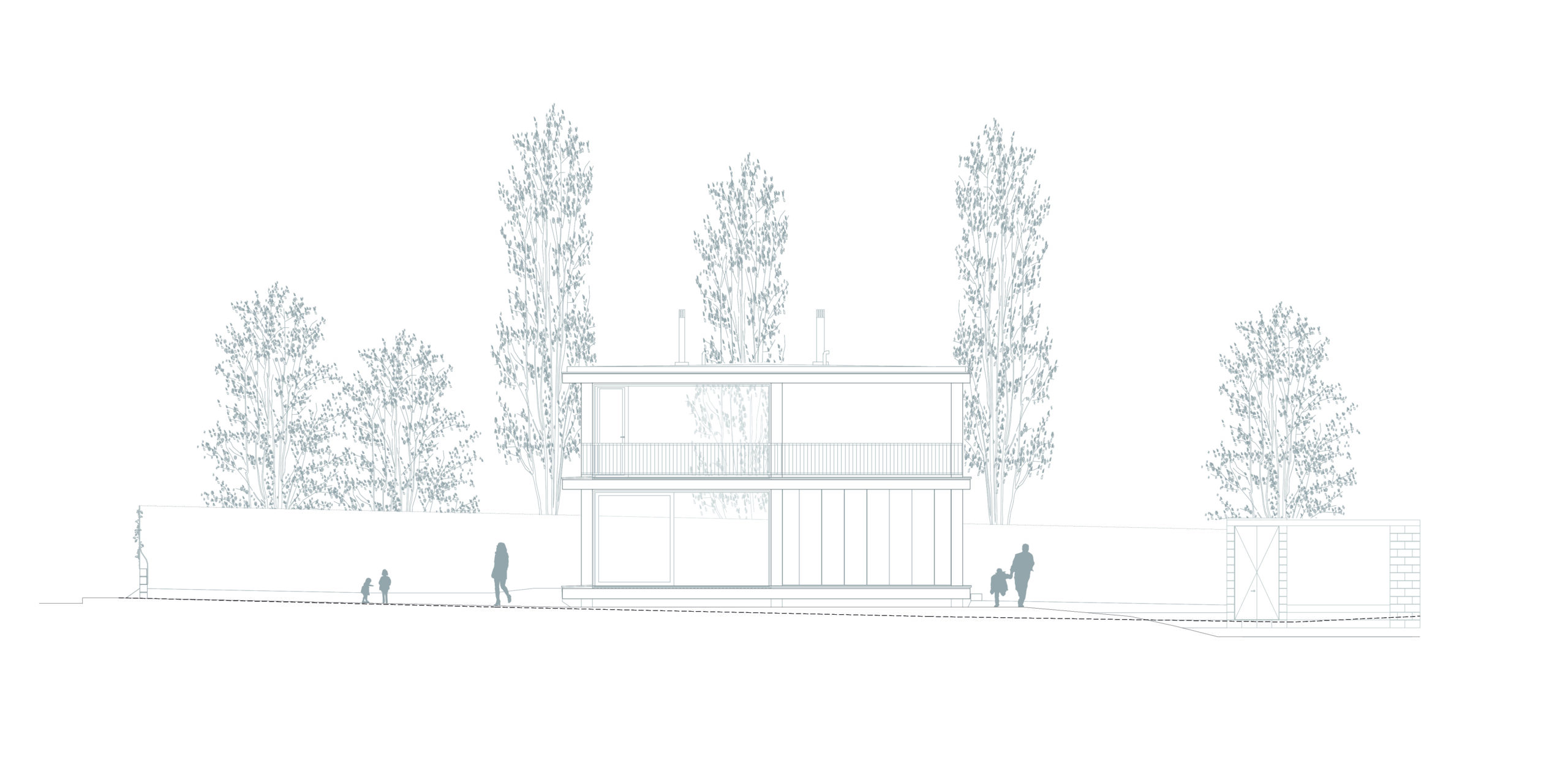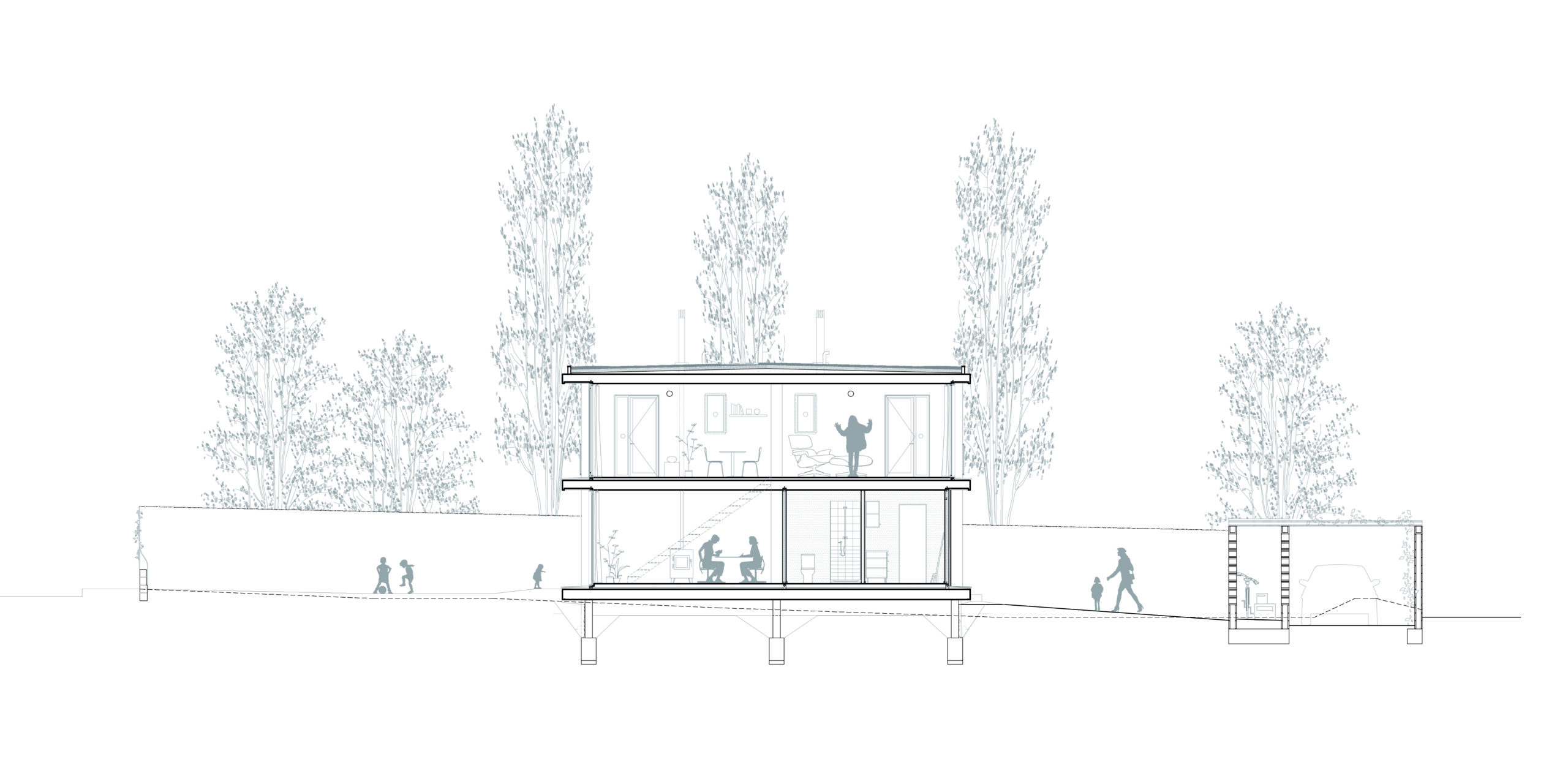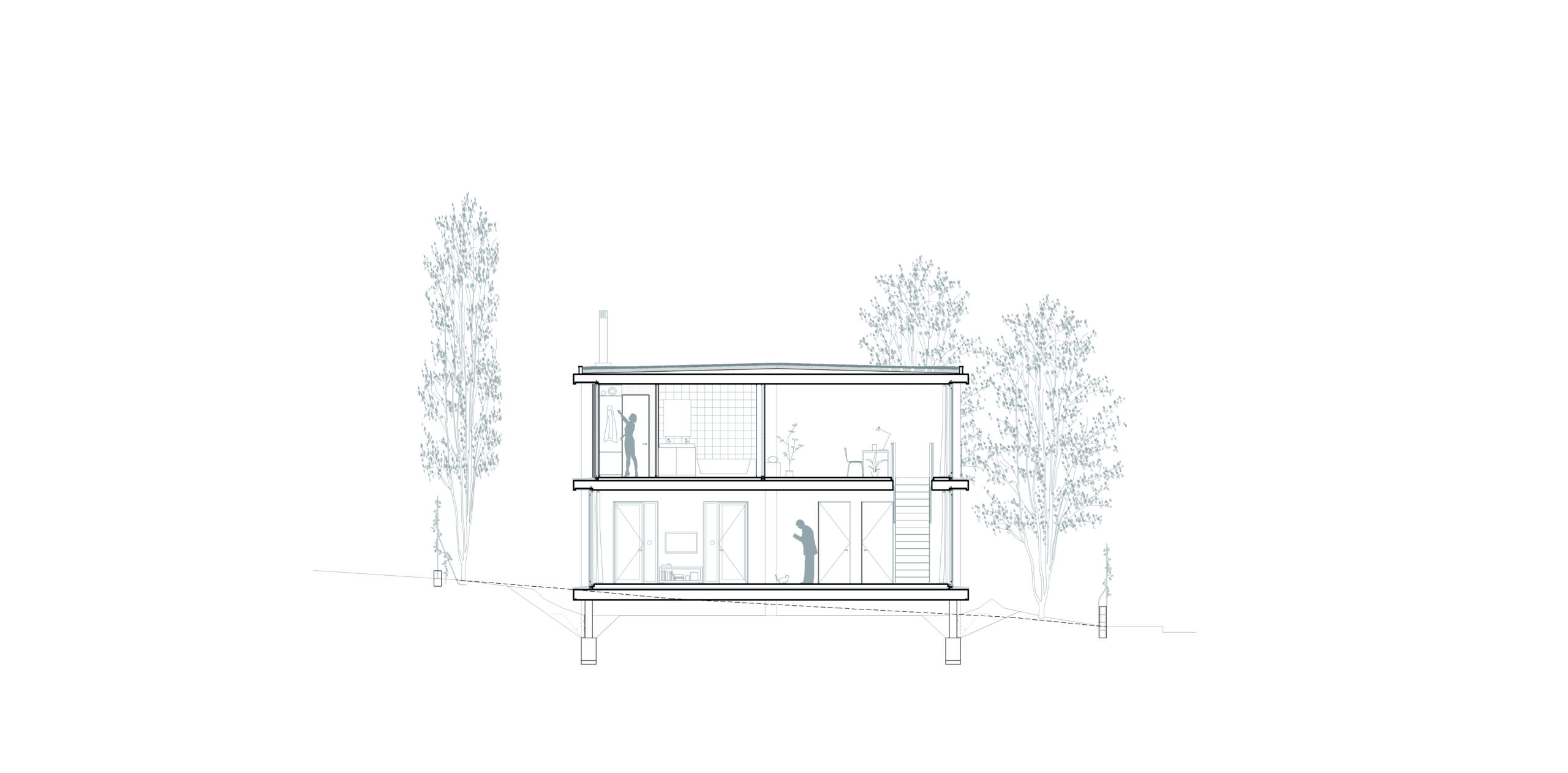 las que marcaran la primera lógica constructiva de la casa: una estructura de tres planos horizontales completamente abiertos en su perímetro. Con el objetivo de dar respuesta al programa ‘confortable’ de la casa, el 50% de la superfície de cada planta se ocupará con una caja ligera. Estas cajas se dispondran en sentidos contrarios en cada uan de las plantas para marcar la relación más óptima con el exterior según el nivel. La caja de planta baja contiene la cocina y uan habitación auxiliar/almacén. En esta planta la caja se sitúa a norte para favorecer la orientación a sur del espacio galeria, funcionando así como porche en verano y como espacio captador en invierno. La caja de planta primera contiene dos pequeñas habitaciones. Su tamaño favorecerá la apropiación del espacio galeria que funcionará como mirador en verano y como estudio en invierno. Las cajas contienen el confort mientras que los espacios acristalados se convierten en espacios no programados, aptos para ser usados todo el año en vase a un funcionamiento térmico pasivo.