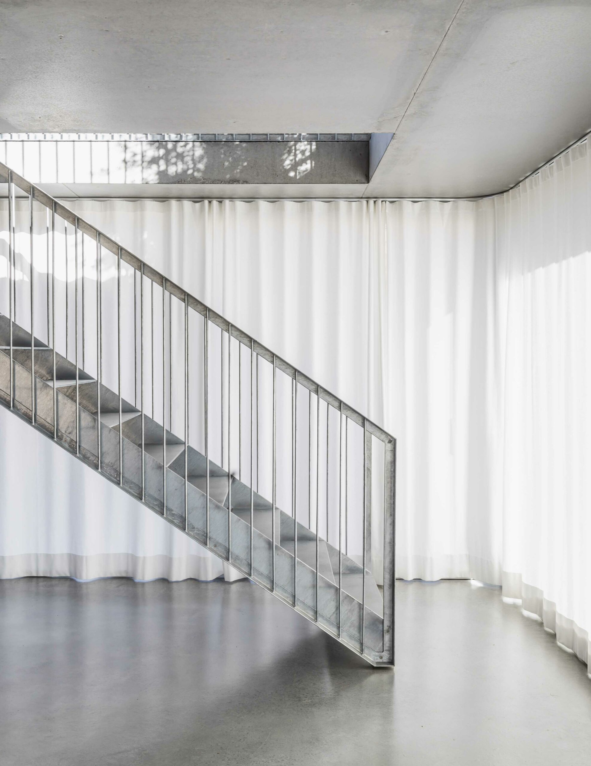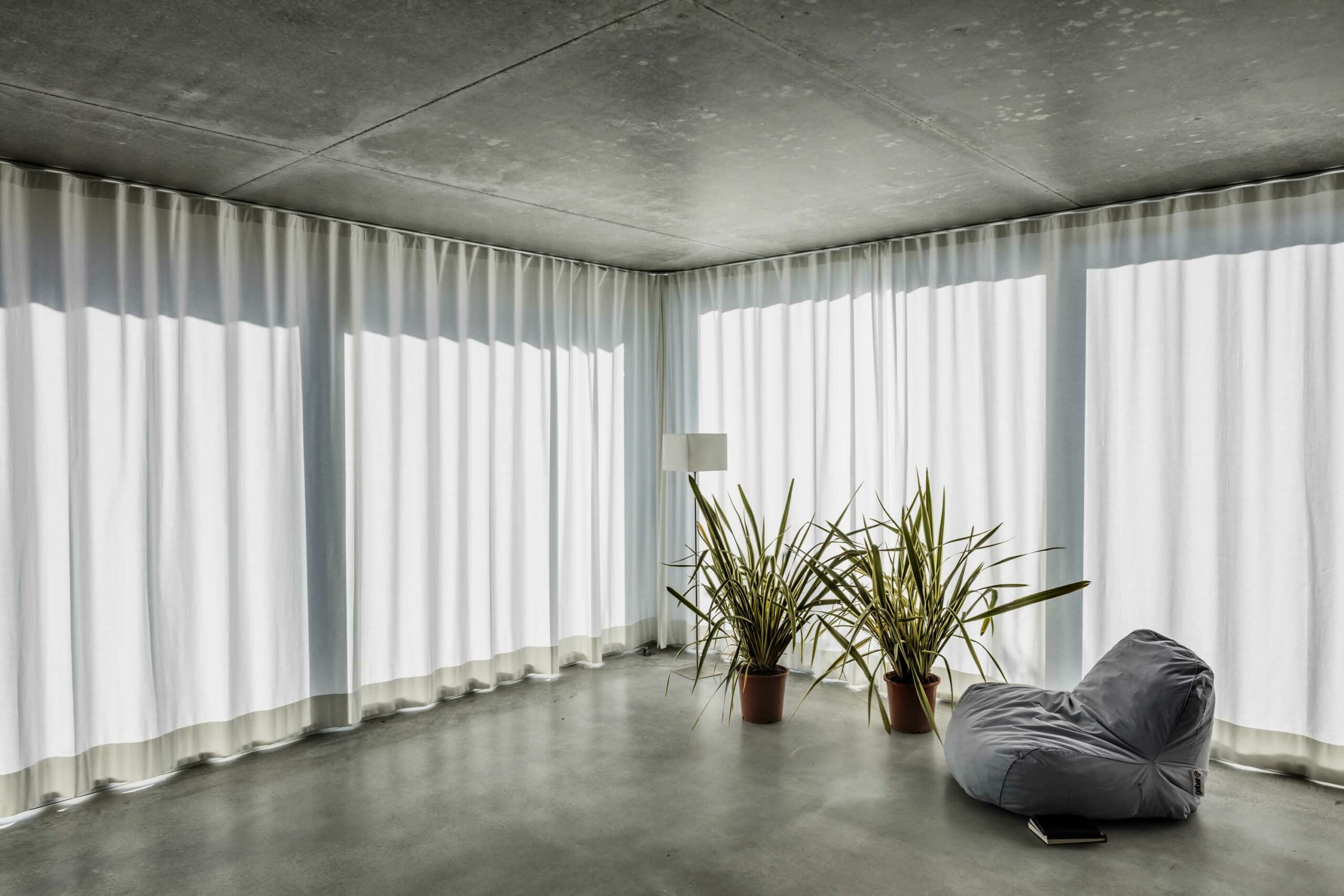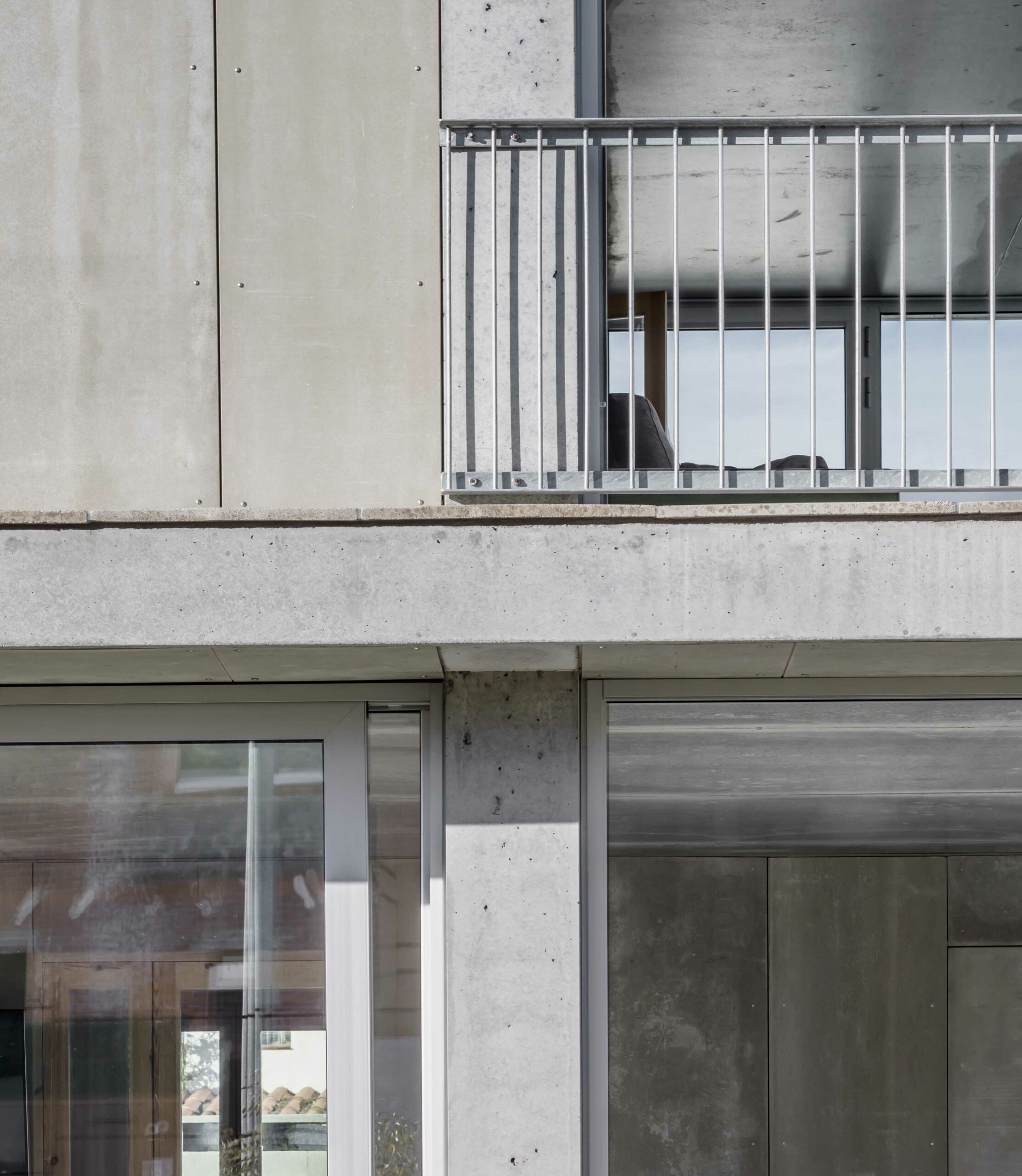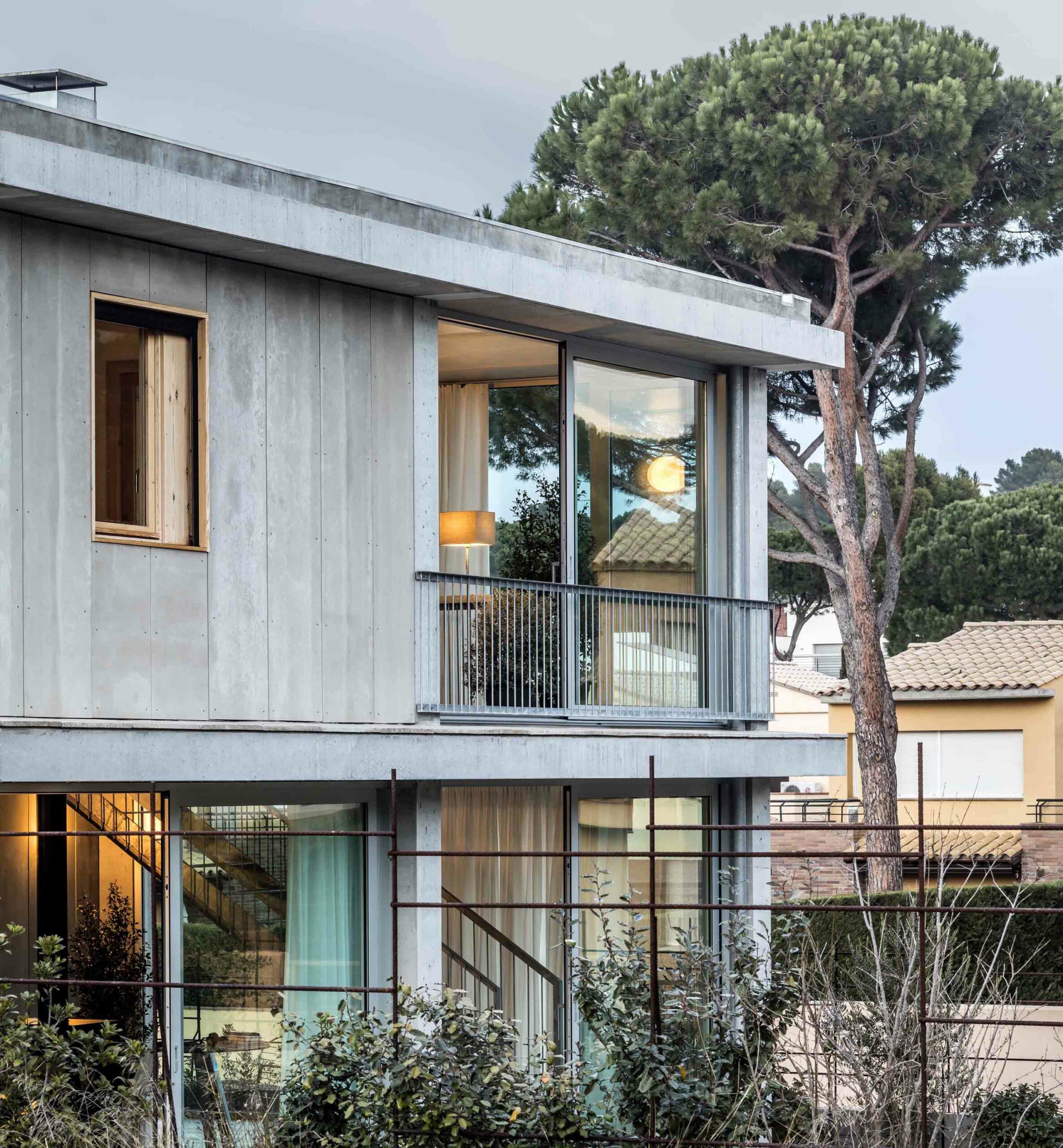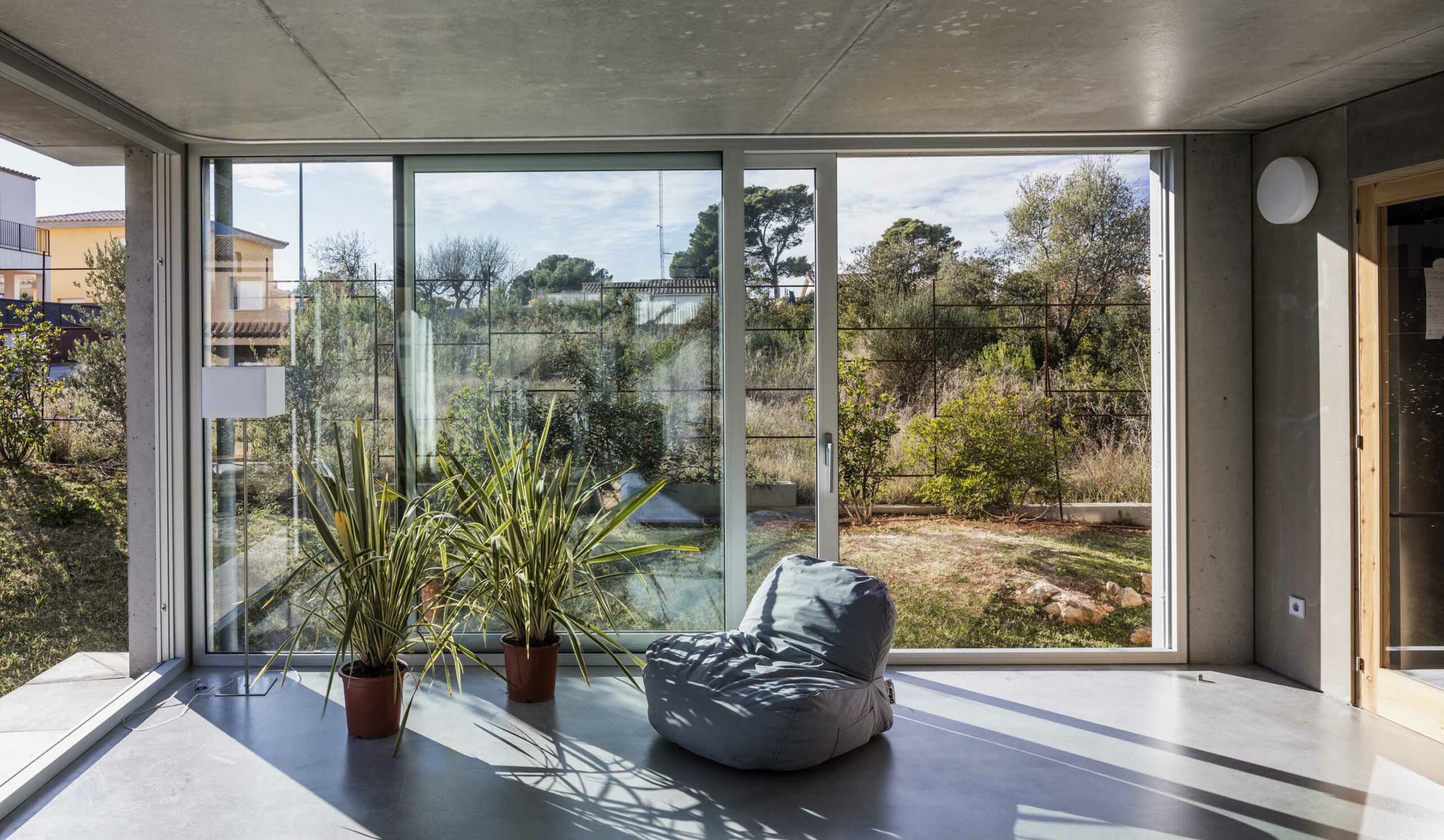 La estructura de pilares y losas es al gran inversión patrimonial de la casa. No sólo contiene su inercia sinó que también caracteriza los espacios galería y por extensión, los de toda la casa. Las cajas pertenecen al mundo mecánico. Están compuestas por entramados de madera y cerramientos de panel OSB y, por placas de cartón-yeso. La cámara de aire de los cerramientos permite alojar una gran cantidad de aislamiento, evitar el exceso de inercia en programas que se tienen que calentar muy rápido en invierno y el paso de todas las instalaciones en una casa con la estructura de hormigón queda completamente vista y no esconde nada. El revestimiento de las cajas es de tableros de madera- cemento.