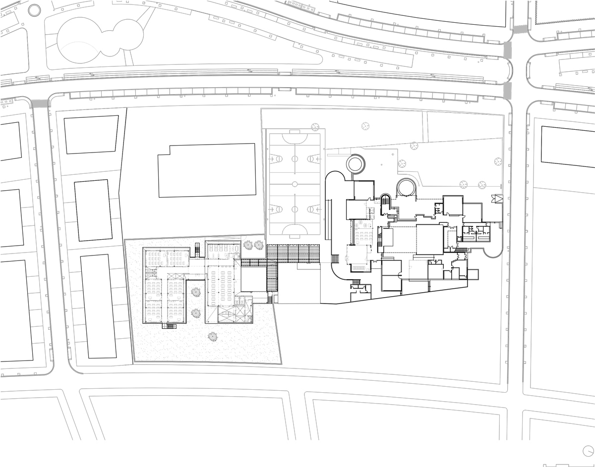 El Departament d’Ensenyament nos presentó una organización en planta que nuestro proyecto debía seguir. Tenia aulas con distintas orientaciones, que presentaban dificultades para su correcta iluminación. Para solventarlo, exploramos un edifico solar, con un límite poroso que llevaba luz agradable y las condiciones climáticas óptimas al interior.