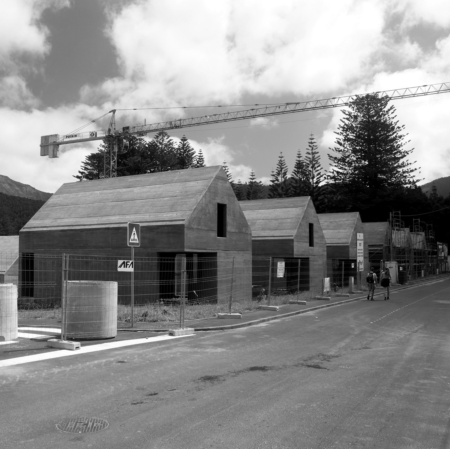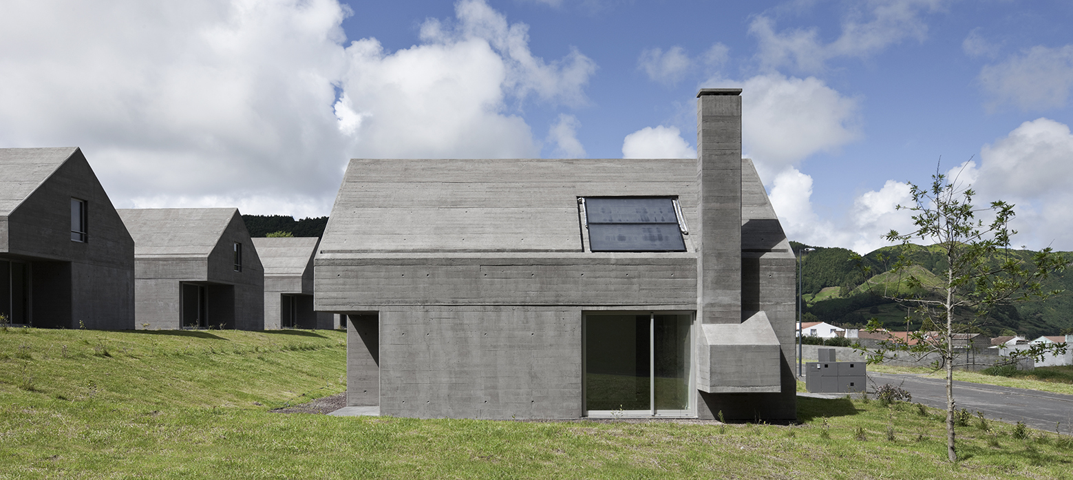 Me parecen unas casas tristes y de una sencillez artificiosa (basta compararlas en la foto 24 con la naturalidad de sus vecinas de teja y revoco blanco). Formas “perfectas” -en el sentido gramatical de “totalmente acabadas” que aceptan mal cualquier intervención del usuario (ampliar una ventana o abrir un hueco adicional, añadir un pequeño “galpón”, darle una manita de pintura…), por mucho que en las cuatro lineas de texto se destaque su versatilidad de uso y potencial de cambio.