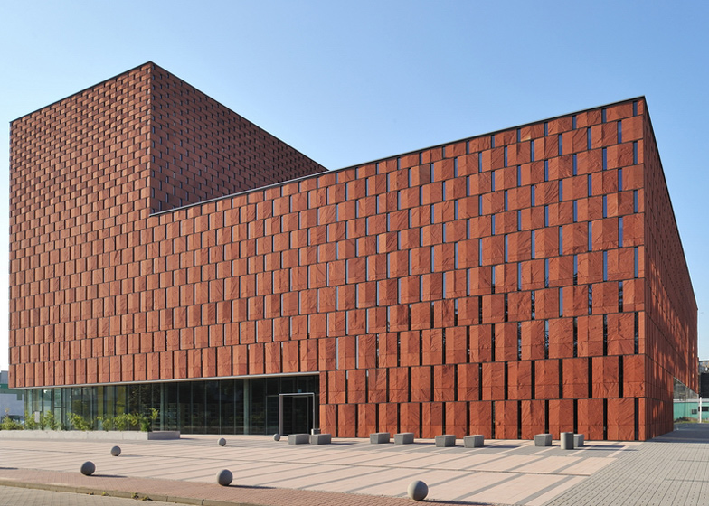 Architects Dariusz Herman, Piotr Smierzewski and Wojciech Subalski arranged the rectangular panels in a brickwork-style pattern to “relate to the raw clay bricks on the neighbouring buildings,” but used a different scale.