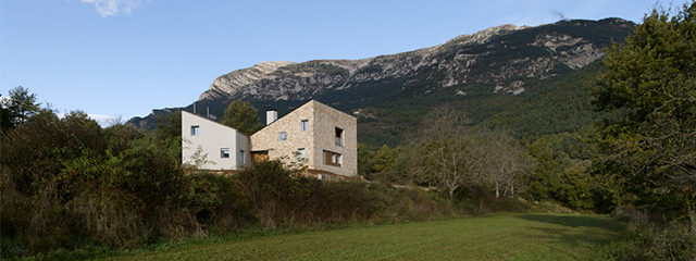 La implantación de la casa está definida por la obligatoria separación de lindes cuyo gálibo resultante, en forma de cuña, contaba con apenas 2,5 metros en uno de sus extremos. La casa a cuatro vientos, formada por sótano, planta baja y primera, aprovecha la parte más ancha de la zona edificable. Dos volúmenes de 5,80×11,50 cada uno, encajados en la topografía del lugar, desplazados y girados el uno respecto del otro, son englobados bajo una única cubierta inclinada — de tejas planas de pizarra — a dos aguas, reemplazando la tradicional cumbrera central por una gran limahoya. Esta morfología representa una apuesta novedosa dentro del entorno local, que no solo confiere interés formal sino práctico, ya que alarga el asoleamiento de las fachadas sureste y suroeste considerablemente y facilita el aprovechamiento de aguas pluviales para riego. Al contar con más altura en las fachadas noreste y suroeste, se han podido ubicar dos terrazas cubiertas o “loggias” en planta primera, beneficiándose así de las espléndidas vistas montañosas por un lado y de la captación de luz natural por otro.