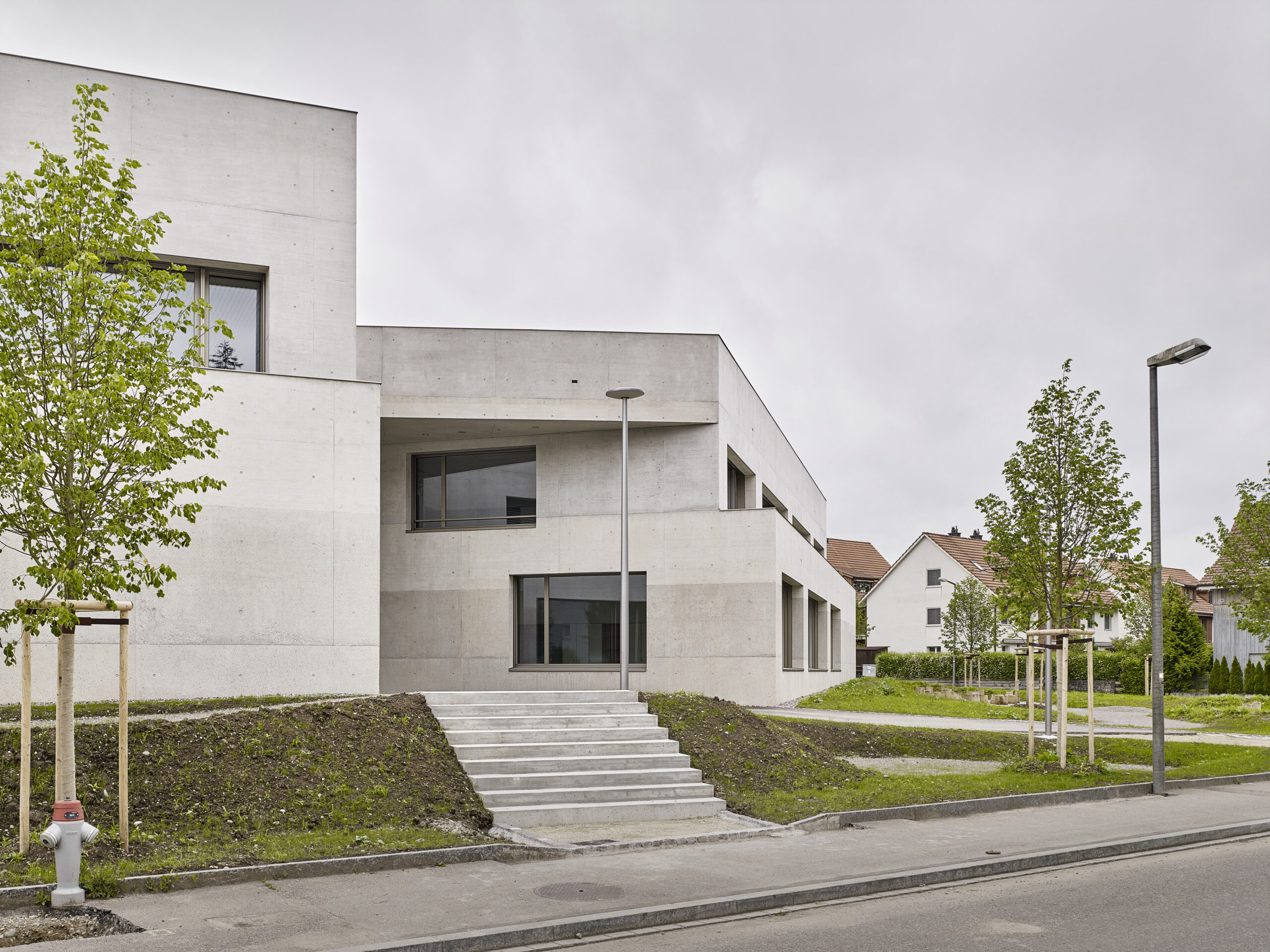 The building shell of the schoolhouse is made of fair-faced concrete. With this choice of material, the school follows a long tradition of schoolhouses made of fair-faced concrete. Fair-faced concrete is ideal for presenting the plasticity of the individual structures forming a whole.
