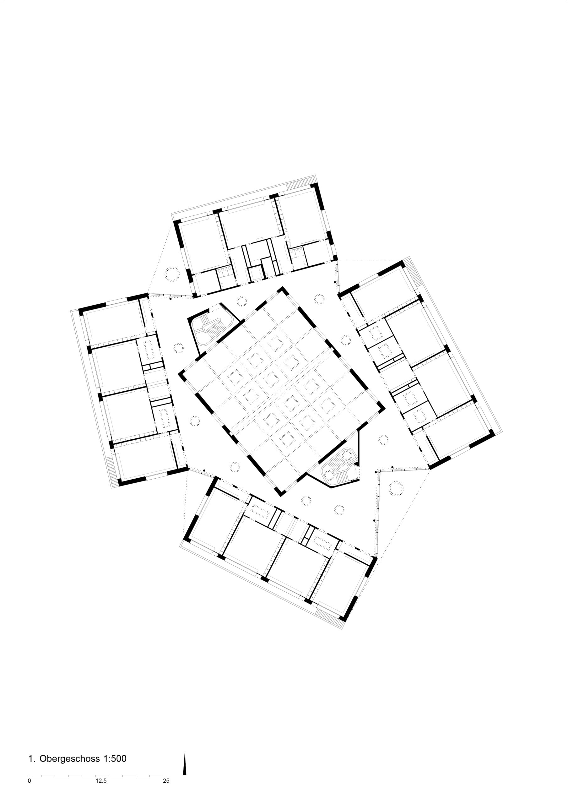 The central location of the property offers an opportunity to establish a social centre for the quarter with the school building. The schoolhouse as a flat structure with a reclined silhouette is embedded in the slightly rising topography between Binzhofstrasse and Ruchwiesenstrasse. With its striking horizontal extent, the school signals its public importance. The schoolhouse consists of individual building sections. Four clearly defined, two-storey wings arranged around the central, double gymnasium in a fan shape are home to various school uses. Notches identify the four entrances which link the school to the quarter on all sides. The school building with its concentric structure serves as the focal point of the residential quarter.
