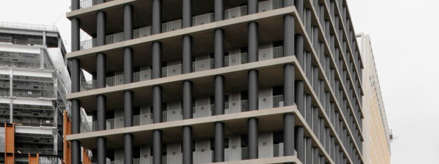 The brief called for an office building with narrow (20m x 46m) footprint and a maximum height of 38m above street level. Situated on a new public square, the volume is visible from all sides calling for a strong visual identity. The design expresses strong tectonic horizontal and vertical elements: concrete floorplates extend beyond the building’s envelope while 396 cast iron columns emphasise and articulate the rhythm of the façades, adding character and depth, and recalling traditional post and beam structures. The columns stand clear of the rainscreen on the south façade, defining balconies on the upper floors giving the building a clear ‘front’ towards the urban square. On the other façades, the columns are engaged and form part of the envelope on the upper floors. Cast by a foundry in Halifax with a surface pattern of woven straps, the columns are both a reminder of the site’s industrial past and a nod to Gottfried Semper’s theory about the role of weaving in the evolution of man-made structures.