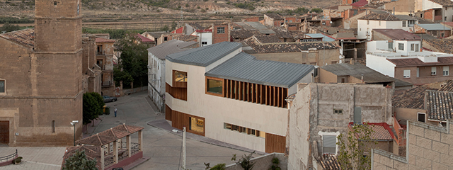 Bajo estas condiciones de partida, ¿cómo puede un edificio de esquina entre medianeras, de tamaño similar al resto del caserío, responder -tanto exterior como interiormente- a la representatividad que exige su carácter público e institucional? La respuesta del proyecto se articula en torno a tres mecanismos relacionados: la composición abstracta, la escala y la singularidad de los huecos, y el recurso al vacío como generador del espacio. Las acciones de sustracción o vaciado operan a tres niveles: en la trama urbana, con la creación de un patio-plaza de actividades, abierto en el interior de un casco histórico denso y colmatado; en el interior del edificio, mediante vacíos verticales y conexiones visuales y espaciales que amplifican el espacio; y en la fachada principal, configurando los elementos más representativos -el porche de acceso y el balcón del ayuntamiento- como hendiduras en la continuidad del plano exterior.