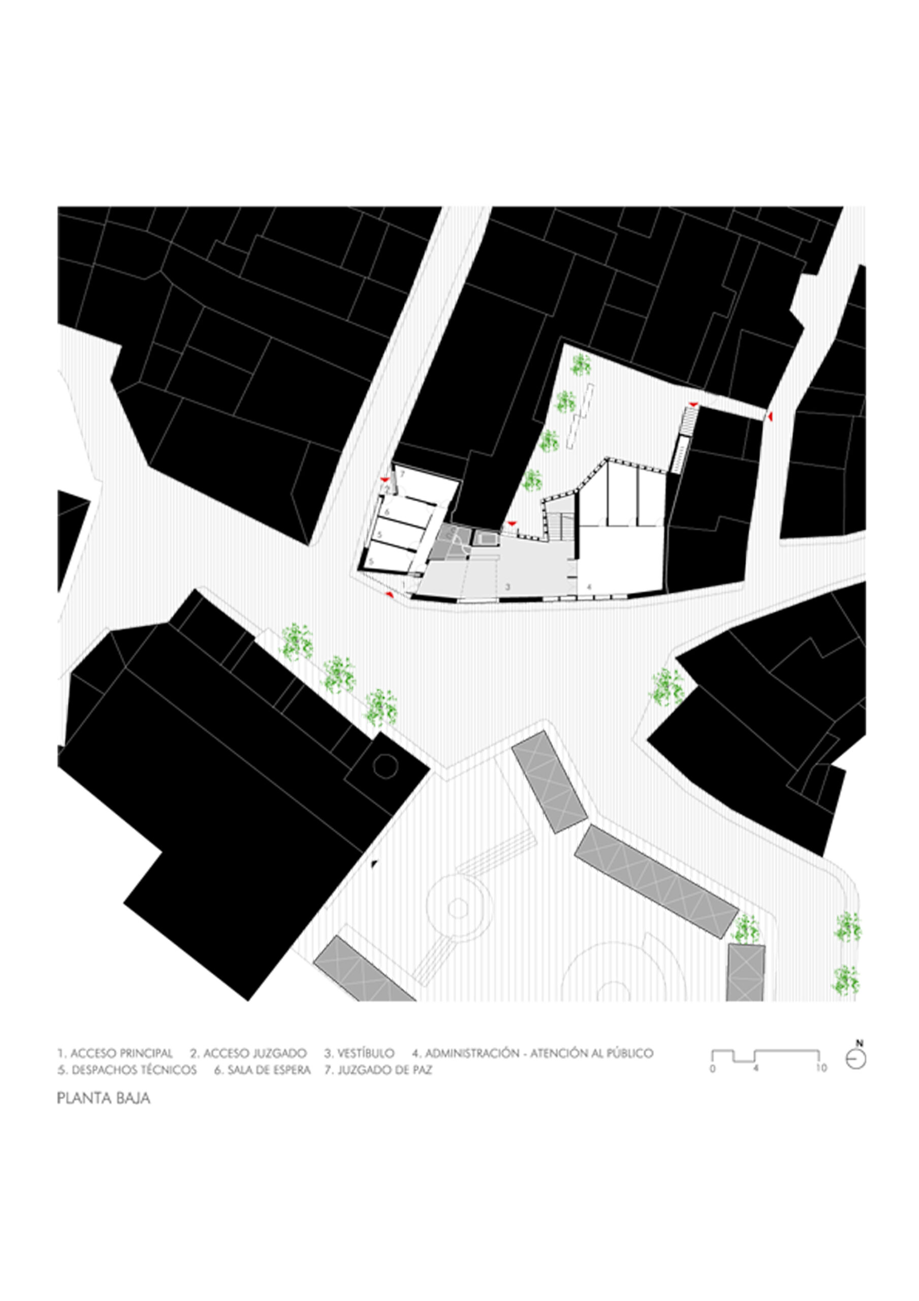 Dada la especial significación del solar en la estructura urbana, completando el lado este de la Plaza de España, el objetivo inicial de la actuación es la configuración del ámbito urbano de la plaza, mediante un nuevo frente que subraya su presencia institucional, y organizando los recorridos y espacios públicos interiores como una prolongación del espacio urbano. La ordenación de las plantas, situando el programa administrativo en los extremos y los espacios de circulación en la zona central, responde a la voluntad de establecer relaciones espaciales y visuales entre la plaza, los espacios públicos interiores y el patio abierto posterior, como muestra la sección transversal del proyecto. La plaza, el patio, los elementos de circulación y reunión se convierten en los aspectos fundamentales del proyecto. El nuevo patio o plaza interior cuenta con accesos tanto desde el edificio –en planta baja y primera- como directamente desde la calle lateral.