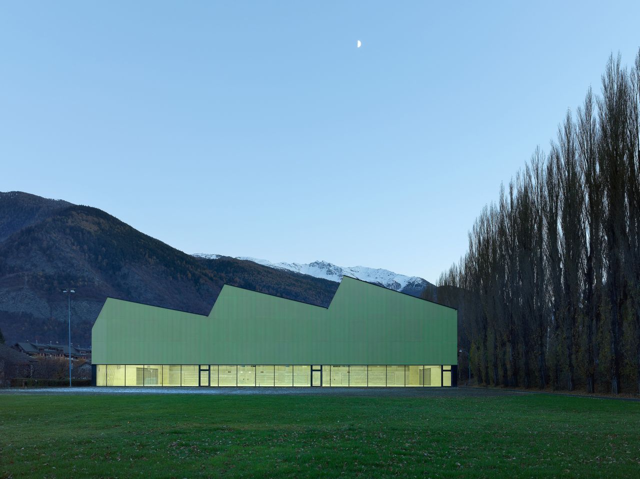 The valais canton and the visp vocational college had a sports centre constructed at one end of the existing college complex. The building is a single, compact structure consisting of the sports halls part, which is orthogonal, and the service part, which is lower and whose shape is adapted to the outline of the existing buildings. Thus, the design adds a new dynamic to the dialogue between the building and its surroundings; empty spaces become paths, public areas, entrances. The building’s footprint maximises the space available for outdoor sports fields.