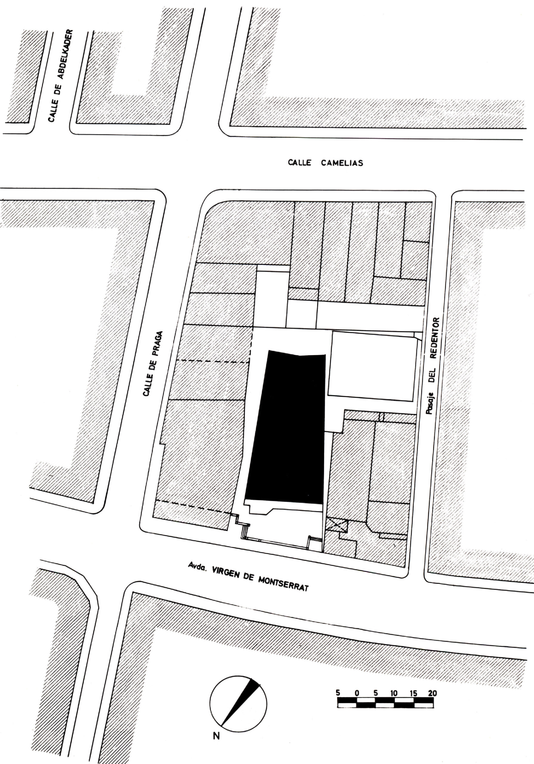 Iglesia anexa a un conjunto parroquial ya existente, situado en una trama urbanística uniforme de manzanas cerradas. La preocupación principal fue la de ubicar adecuadamente el edificio para que quedara integrado a su entorno pero, a la vez, significado como elemento de carácter público. Se interrumpió la edificación continua y la iglesia se retiró de las alineaciones para dejar un pequeño patio de entrada, que la articulaba con los bloques residenciales vecinos y con las dependencias parroquiales ya existentes.