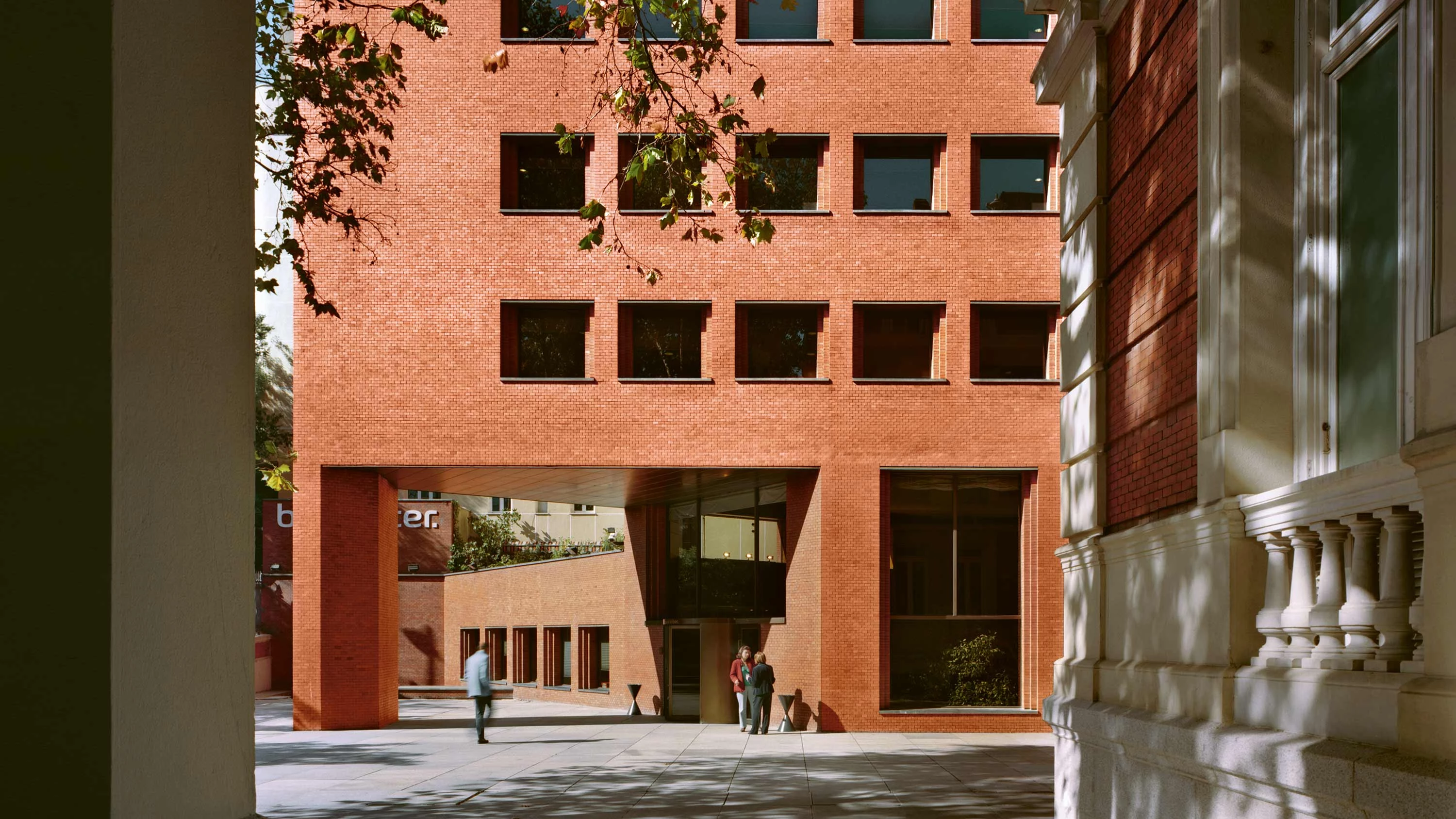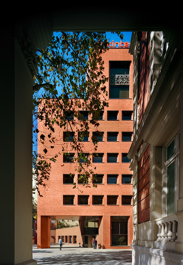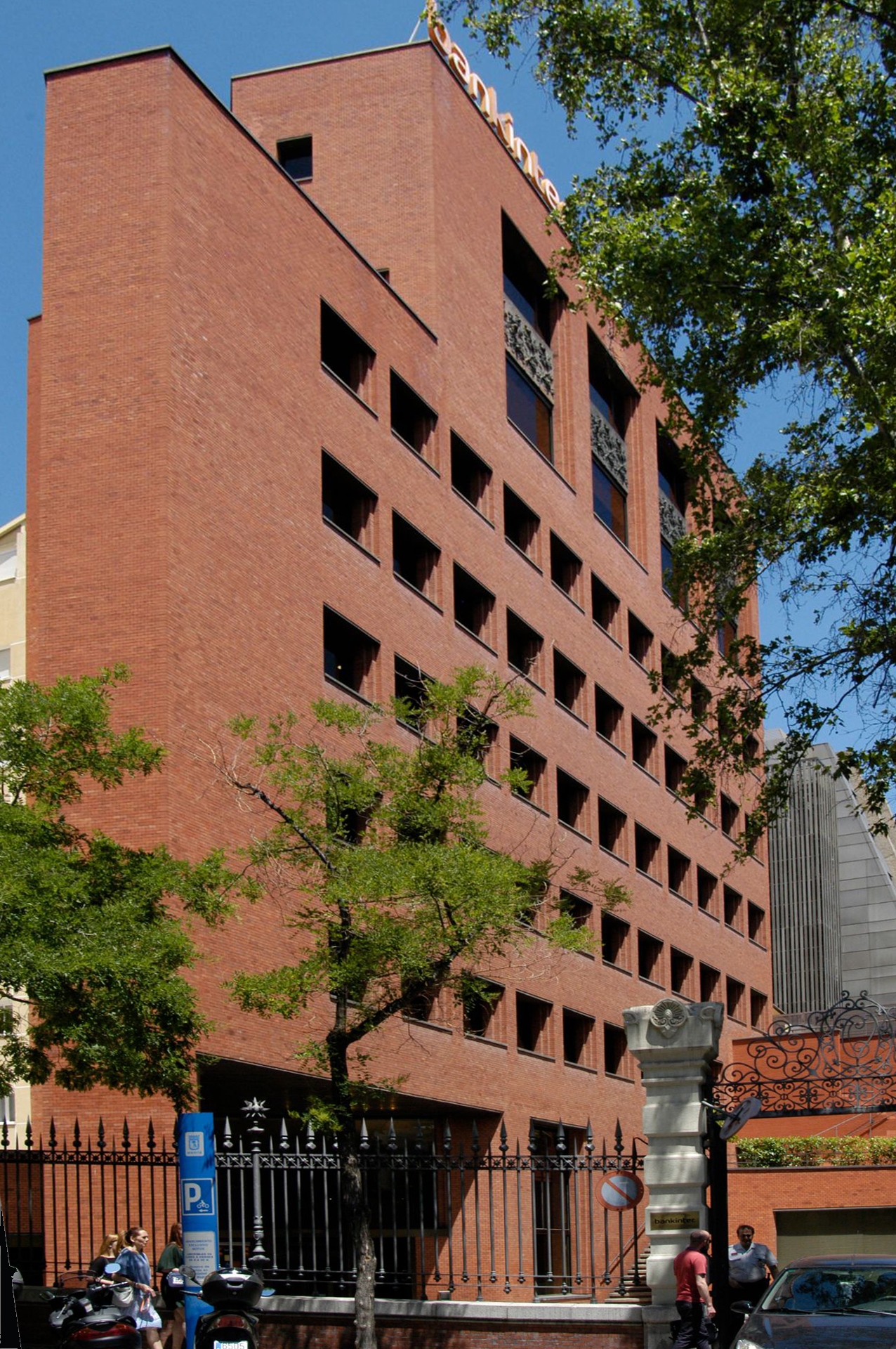 Pero tal independencia no es óbice para que el nuevo edificio pague tributo de respeto al palacete existente utilizando para la construcción del mismo un ladrillo prensado similar. Bankinter hace uso de una geometría en la que las directrices oblicuas prevalecen y en la que la atención a todo lo contingente –circulación, ordenanzas– contribuye definitivamente a establecer el rotundo volumen.
