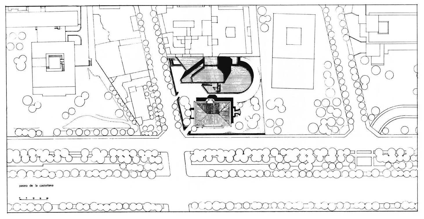 El cambio del acceso –que se produce ahora desde la calle Marqués de Riscal y no desde la Castellana– da lugar a que los edificios mantengan su independencia y a que la afilada esquina/proa –a que da lugar la diagonal que impone la servidumbre a las ventanas del edificio colindante– exagere la altura del edificio.