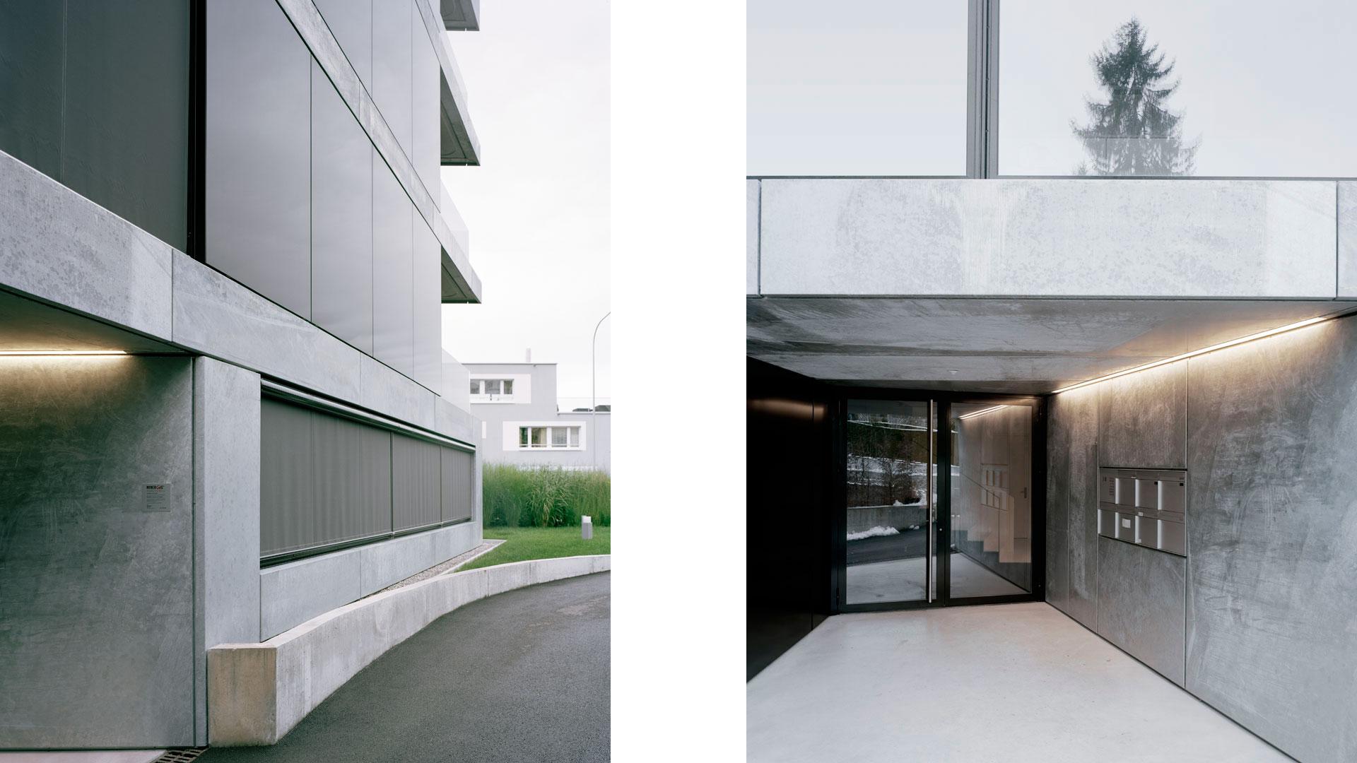 The new construction is composed of three full stories and one partially sunken basement floor. Beginning on the first level above ground, each floor contains two apartments. Each has a center with a circulation core and bathrooms, such that the spaces benefit from their orientation towards both the lake towards the north and the hillside towards the south.