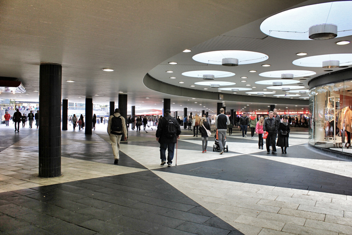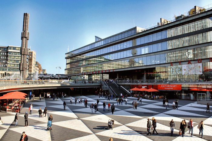 Designed and built by Peter Celsing, the Kulturhuset is located on Sergels Torg in Stockholm, one of the busiest squares in the Swedish capital. This complex was conceived as a “cultural oasis” in the new business and commercial center. In this area of the city, from the 1950s to the early 1970s, the old structure and architecture of Stockholm, and partly even the topography, was almost completely replaced. The building which opened in 1974 is considered the most famous work of Peter Celsing, apart from his sacral buildings.