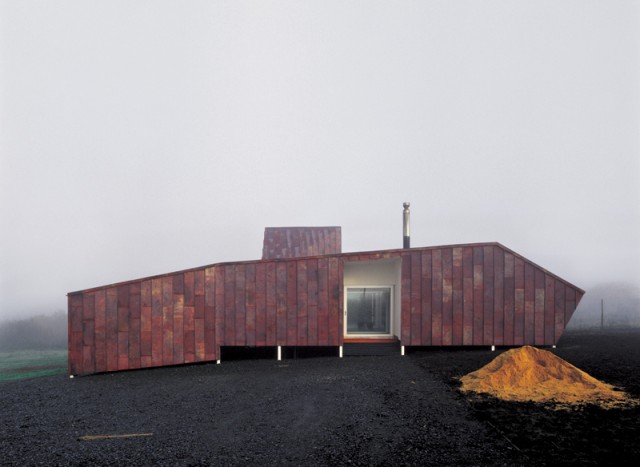 Esta casa es una segunda prueba con el cobre como revestimiento exterior. En Nercón, al sur de Chile, la textura ondulada del cobre parecía adquirir un rol histórico al copiar la usada hasta principios del siglo pasado en casas e iglesias de Chiloé revestidas con acero galvanizado. En esta construcción, la textura modulada -38.5 x 95 cms. en 0.5 mm. de espesor- de cobre electrolítico emballetado también imita ciertos aspectos generales de sus alrededores. A saber, de los pesados mantos de tejas caídos sobre el terreno que abundan en la zona, las deformaciones de sus geometrías simples debido a las sucesivas ampliaciones y desmoronamientos, las sombras profundas bajo ellos y el grano continuo de su envolvente.