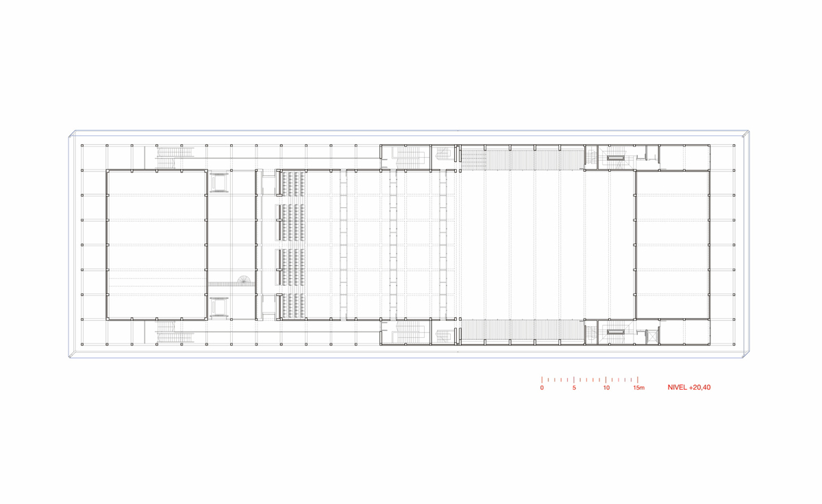El contexto que nos interesa es la memoria de un territorio abstracto específico. Por ejemplo, la realidad de las grandes estructuras industriales que funcionan como hitos de referencia arquitectónica en un paisaje como la ribera de un río, sin las cuales resultaría desolado e intrascendente. Pensamos que justamente contra este desamparo dimensional luchan las esculturas dispersas en el Parque Ribera Norte donde se situará el teatro, y que en cambio es la extensión llana y a ras de agua del Puente Viejo, la que mide de manera justa el lugar y le da una escala regional adecuada, sin caer en los sobresaltos de los nuevos puentes. Por otro lado, suponemos que al igual que las torres de enfriamiento, fotografiadas por Bernd and Hilla Becker en 1973, (Bernd and Hilla Becker, torres de enfriamiento, 1973) la escala imprecisa del edificio dada por la abstracción funcional de su forma (embalaje) es una manera de manejar este desamparo.