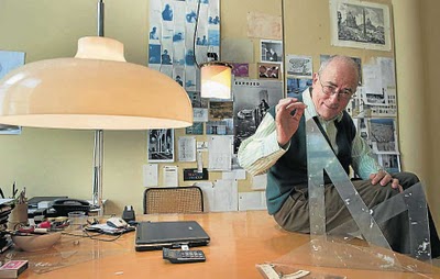Visito a Lluís Clotet en su estudio del Poblenou, en busca del secreto del momento creativo. Me recibe en un soleado despacho. Los muchos rastros de cinta adhesiva en la mesa, que usa para fijar papel cebolla sobre el que dibuja con estilográfica, evocan las largas horas de labor. Escuadras y cartabones lucen también la huella del tiempo. Clotet teclea en un portátil, pero en la mesa hay instalado un paralex.A su espalda, sujetas en un tablero con chinchetas, conviven fotos de edificios históricos y modernos.