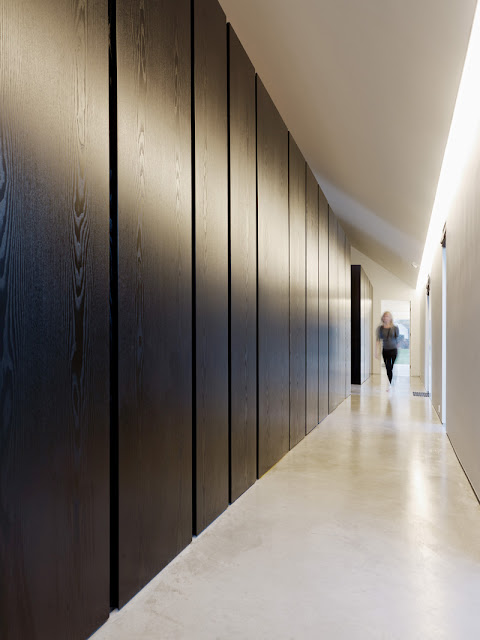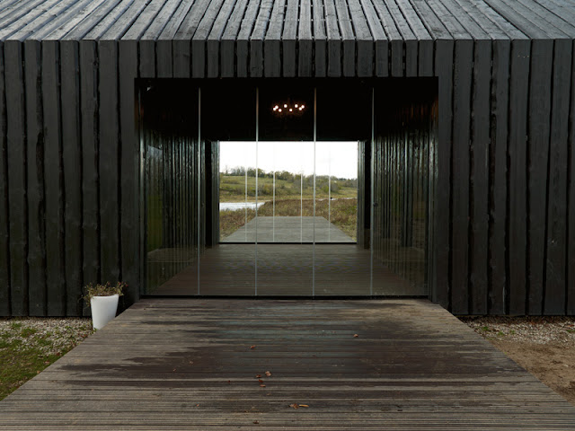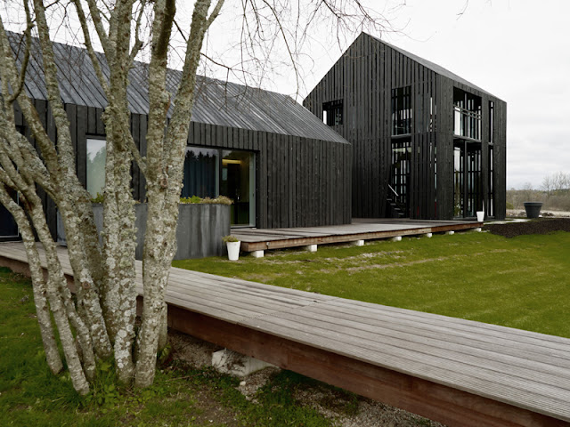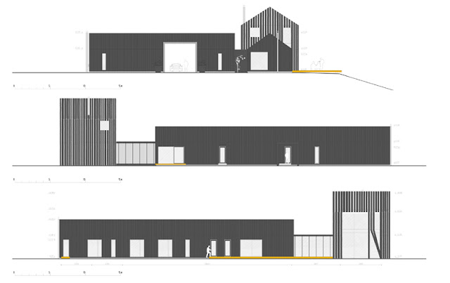 Initially planned as a holiday house, at the end of the design process – socially active family’s living house complex at the River Venta near Kuldiga. The place drags in to live there. Placed within the existing relief the cellar volume is ending up the planed garden with a solid rock wall. More over the garden within the gully will be protected from prevailing winds. The cellar is located at a distance from living complex, while the visual link is provided through an opening in the garage building. 8 BLACKS is a modern approach for traditional living complex in Kurzeme adopting the archetypal cross-section as a common element for all buildings. Union of traditional and modern in the image of the house entail sense of inheritance and belonging at the same time providing the necessary comfort for active living. Using one material for both – walls and roofs – homogenous look of the building is achieved; surface texture and details are reached by the finish of raw wood planking.