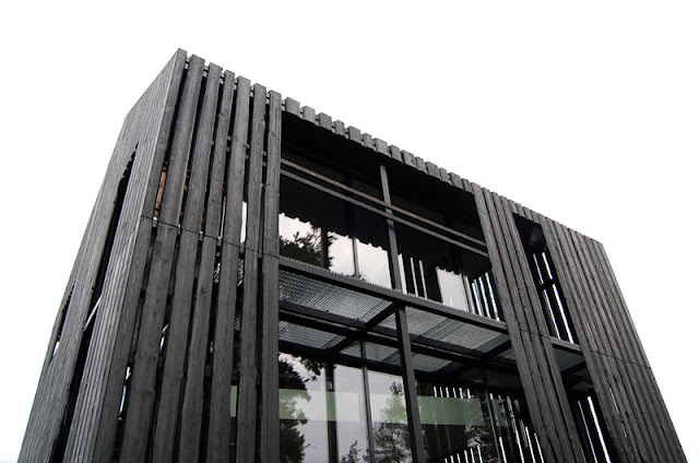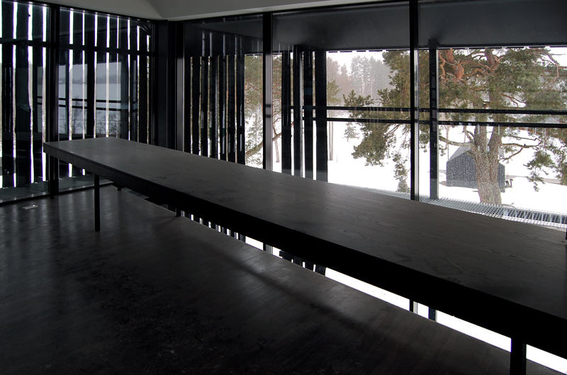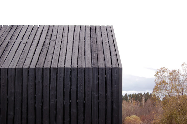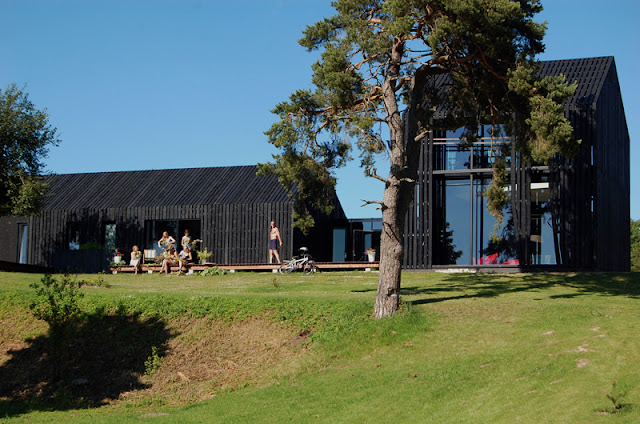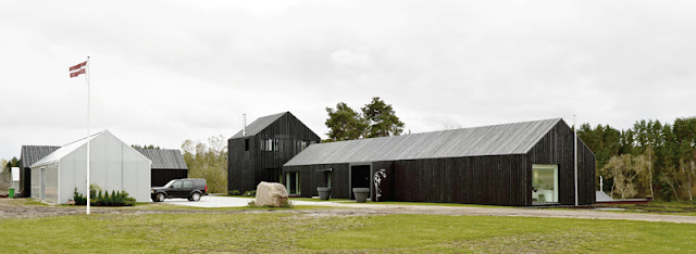 Initially planned as a holiday house, at the end of the design process – socially active family’s living house complex at the River Venta near Kuldiga. The place drags in to live there. Placed within the existing relief the cellar volume is ending up the planed garden with a solid rock wall. More over the garden within the gully will be protected from prevailing winds. The cellar is located at a distance from living complex, while the visual link is provided through an opening in the garage building. 8 BLACKS is a modern approach for traditional living complex in Kurzeme adopting the archetypal cross-section as a common element for all buildings. Union of traditional and modern in the image of the house entail sense of inheritance and belonging at the same time providing the necessary comfort for active living. Using one material for both – walls and roofs – homogenous look of the building is achieved; surface texture and details are reached by the finish of raw wood planking.