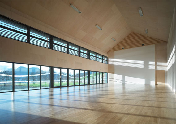 The competition winning design incorporated a large and small hall and a meeting room as well as associated changing rooms, kitchen office and storage. It was to be built into the hillside with level entrances to the two floors to reduce the impact of the large sports hall volume and to avoid installing a lift.