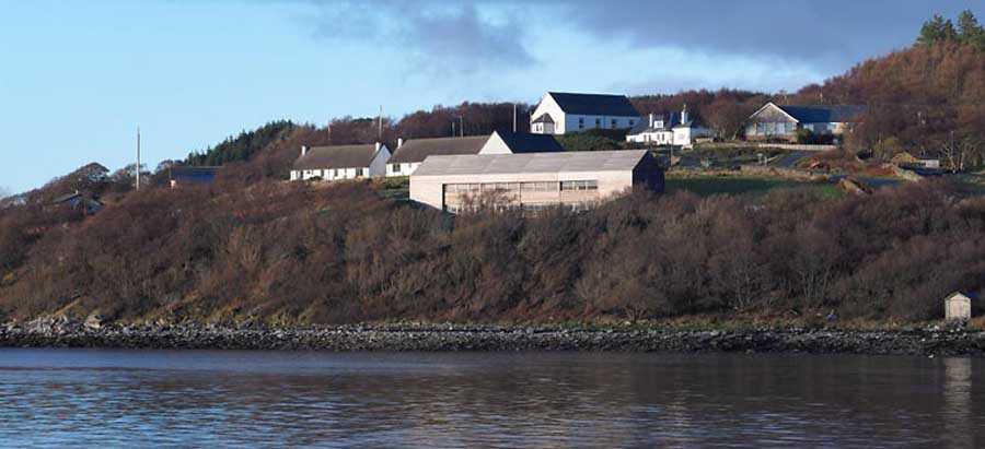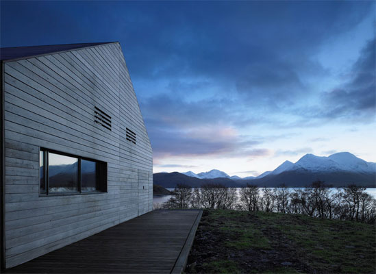 The design is based on the simple agricultural shed. It has a high thermal mass, heavily insulated retaining wall, and a simple steel portal infilled in timber, glass and insulation. The roof is corrugated and stone from the site is incorporated in gabions in the landscape. The building is over insulated, with full but protected glazing overlooking the Sound of Raasay and the Red Cuillins of Skye.