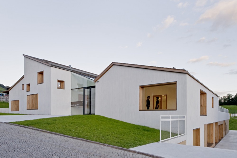 La escuela infantil, del estudio austríaco Feld 72, se encuentra en Terente, un pueblo de montaña al sur del Tirol, en Italia.