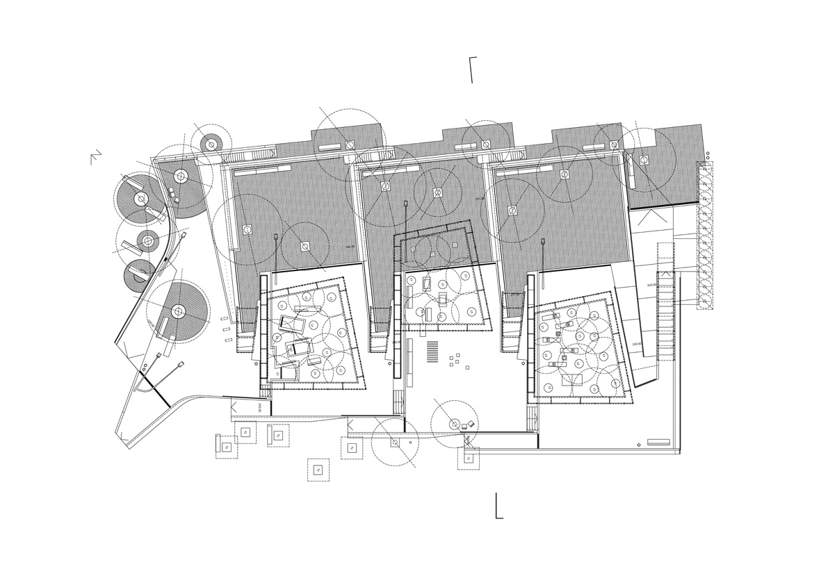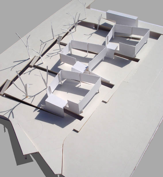 La configuració topogràfica, mitjançant plataformes que defineixen un recorregut principal en ziga-zaga, i la ubicació dels umbracles defineixen una successió de llocs i espais. Uns, els situats sota els umbracles. Els altres, els delimitats pels desnivells topogràfics i pels volums d’umbracles i pèrgoles.
