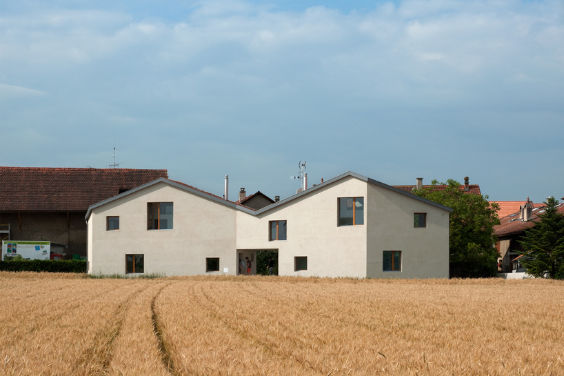 El estudio con sede en Ginebra LRS architectes ha finalizado una casa bifamiliar de dos pisos en el histórico pueblo de Charrot, Suiza.