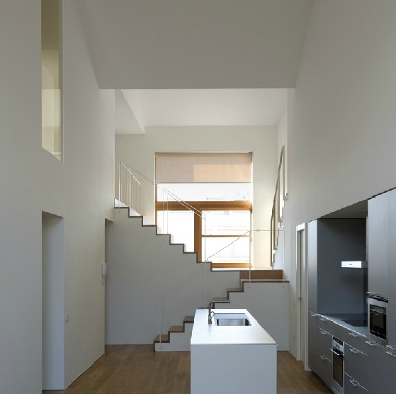 Todas las viviendas del programa se desarrollan en dos plantas de altura, con doble orientación y fachadas al exterior y a los espacios libres interiores. En general, las viviendas constan de una estancia de doble altura a la que se asoman las restantes habitaciones. Las cocinas se integran en el salón.