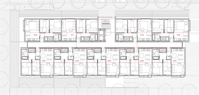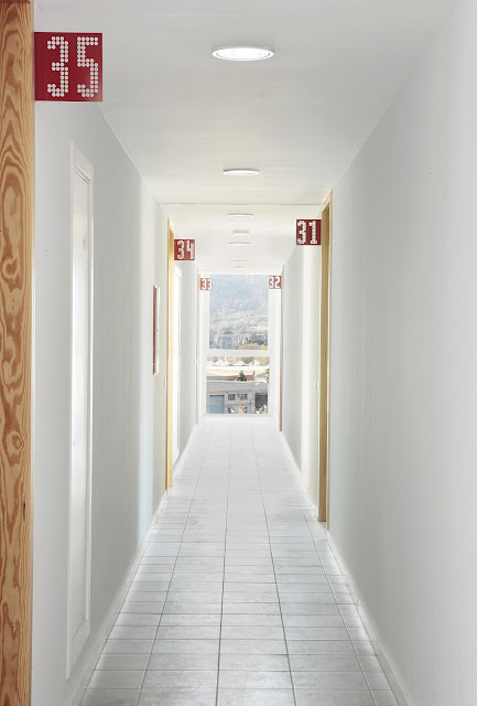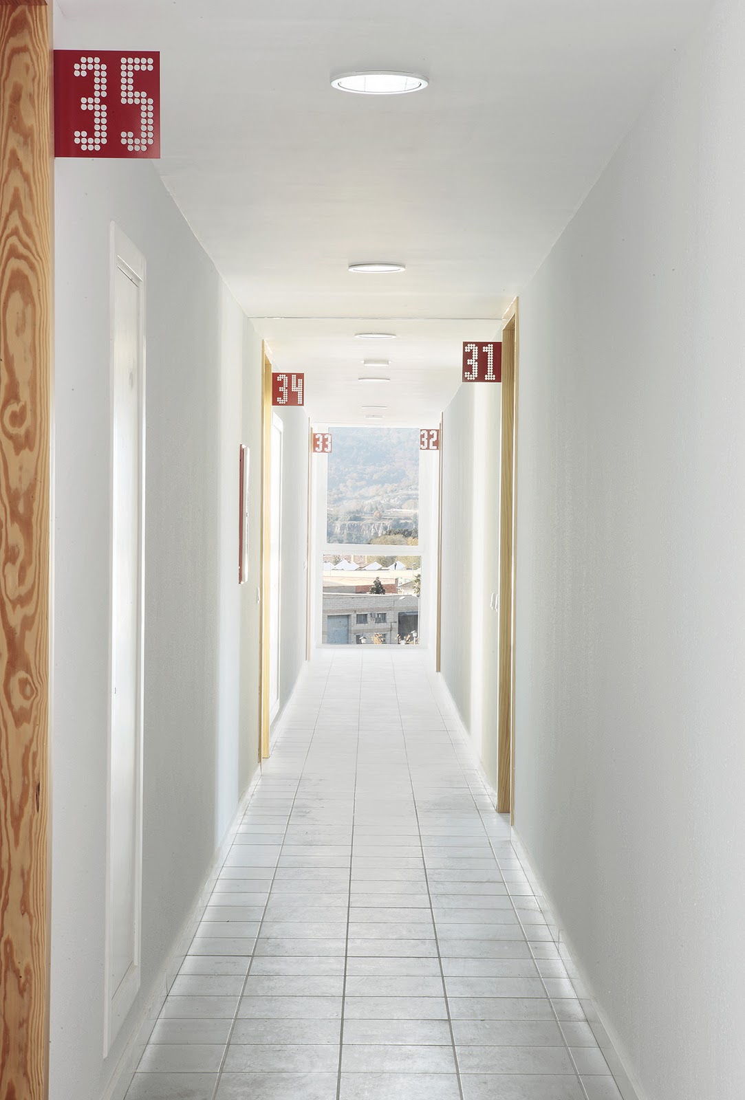 El módulo de la vivienda se organiza en dos ámbitos: zona social y zona de descanso relacionada mediante un espacio de llegada al ingreso. La cocina, baño y armario de lavado se encuentran encima de la pared técnica para acoger el trazado y registro, desde el pasadizo, de las instal·lacions de cada vivienda.