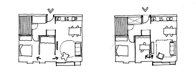 Es una lástima no poder conseguir el paso a través de una habitación intermedia hacia el living-cocina, tal y como se ve en la imagen de lo que parecen “ideas de proyecto” (izq.)