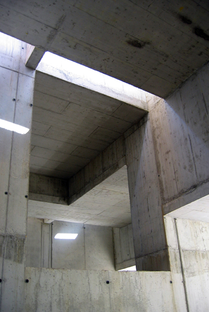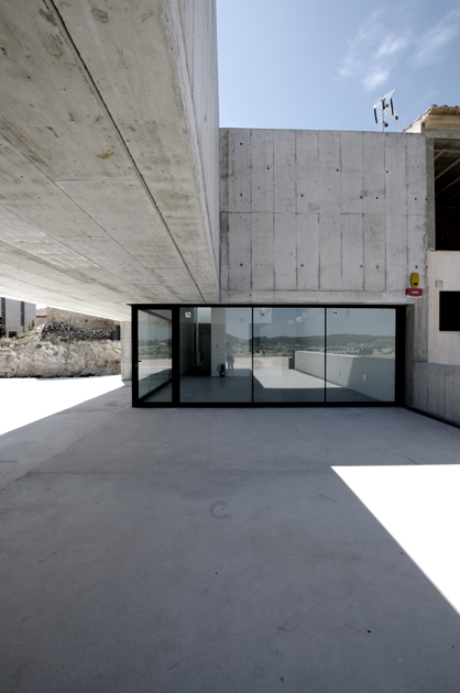 D’altra banda el poble es composa de petites crugies. Aquestes crugies defineixen cases. Cases que estan contingudes entre dos murs mitgers perpendiculars al carrer, construïts en pedra i de gran amplada. Així mateix succeeix en el nostre edifici. S’ordena a partir de petites crugies una al costat de l’altra. Seguint la pauta. Murs de formigó d’un metre d’amplada col·locats en paral·lel i separats sis metres. Aquests murs configuren l’espai, ordenen les instal·lacions, són entrades de llum natural. La seqüència es marca sobre la plaça mitjançant talls de llum. L’edifici és hermètic, tancat, opac, cec. Només unes petites fissures ens permetran entrar al seu interior. Quan baixem a la planta baixa veurem com la llum juga amb la pauta de les mitgeres. Per un costat entra tangent al mur, mostra tota la seva dimensió, el perfila. De l’altre costat el posa a contrallum, retallant-hi un gran forat que permet a la llum entrar més intensa, concentrada i puntual.