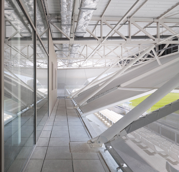 A continuous banded roof spans between two volumes creating an open central void through which the landscape is framed. The supporting inverted trapezoidal bases are faced with stretched micro-perforated fabric concealing hollowed out areas. Visitors access corridors through openings within the inclined partitions, revealing the glass-enclosed clubhouses with screened views of the field. Together with the descending seating, the building’s profile reads as a unified entity.
