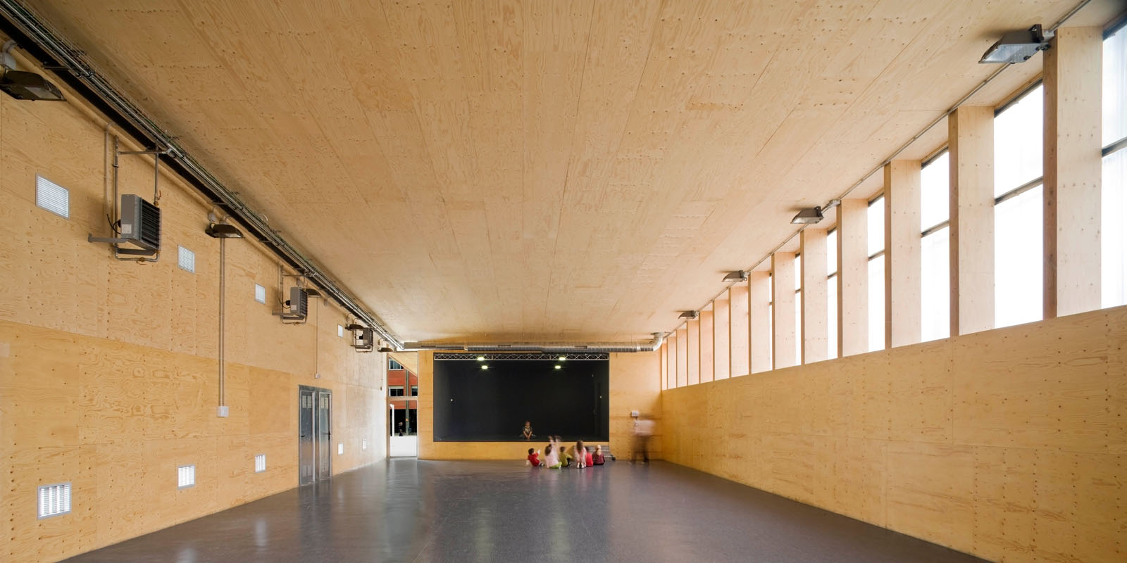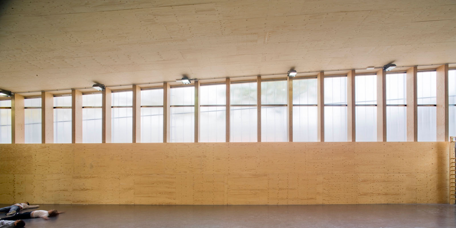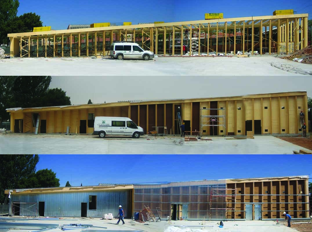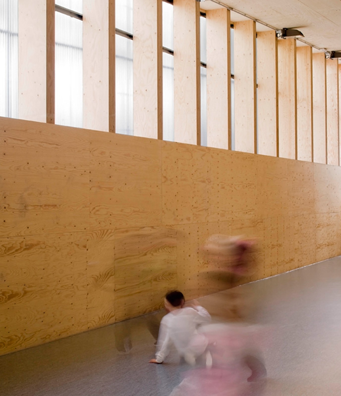 El porche se convierte en el elemento vertebrador del conjunto, y dá acceso a los vestuarios, a la sala gimnasio, mientras relaciona los anteriores con el ámbito de acceso y la pista. La formalización del edificio queda sometida a la lógica constructiva, que parte de una intención inicial de construir en madera mediante un sistema de muros aligerados formados por pórticos, que quedan trabados por el revestimiento interior de paneles tipos.