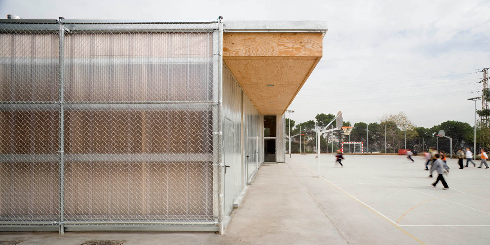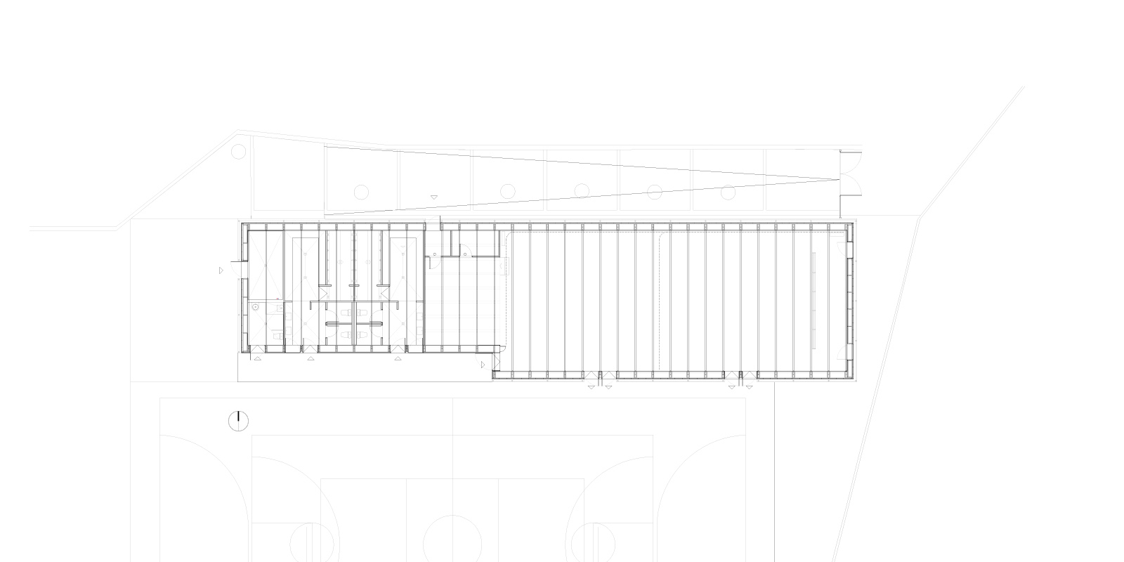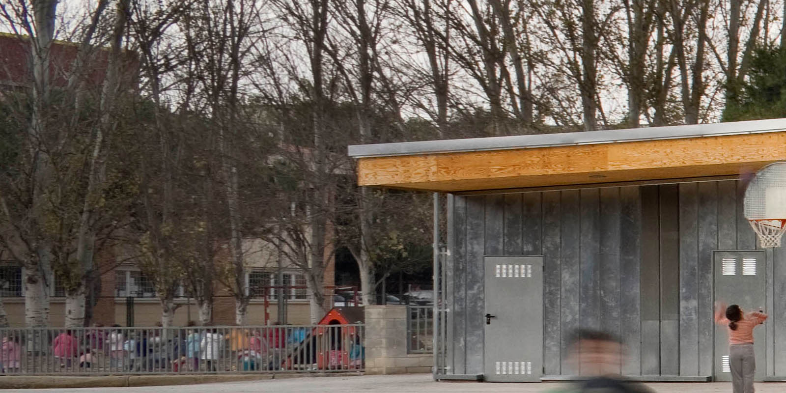 Este prisma se ha adosado al muro de contención de la rampa para no hacer sombra sobre la pista (ahora desplazada de su posición inicial), y permitir una posible gestión de fin de semana independiente respeto el colegio.