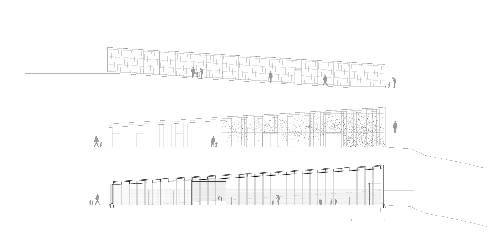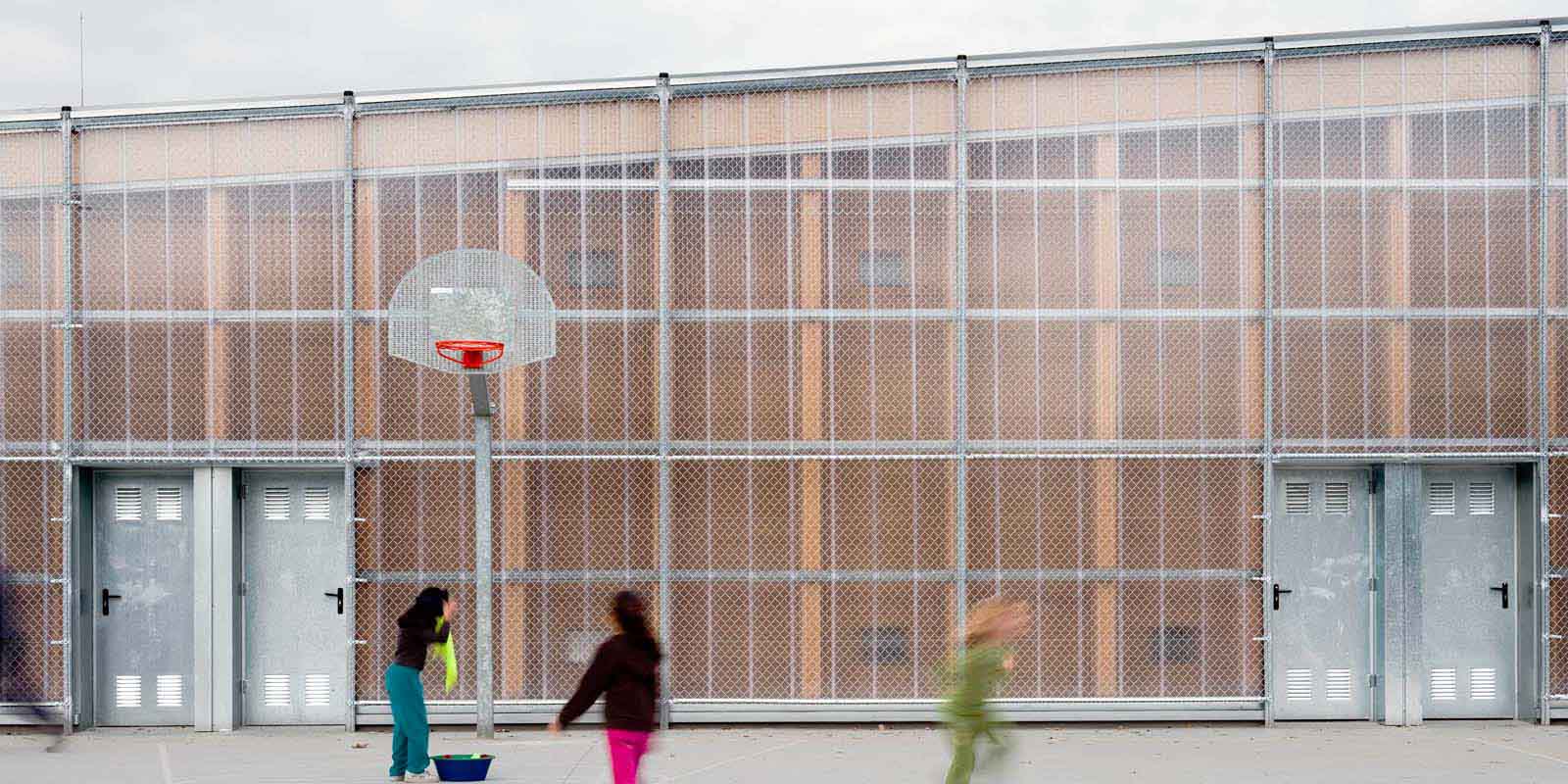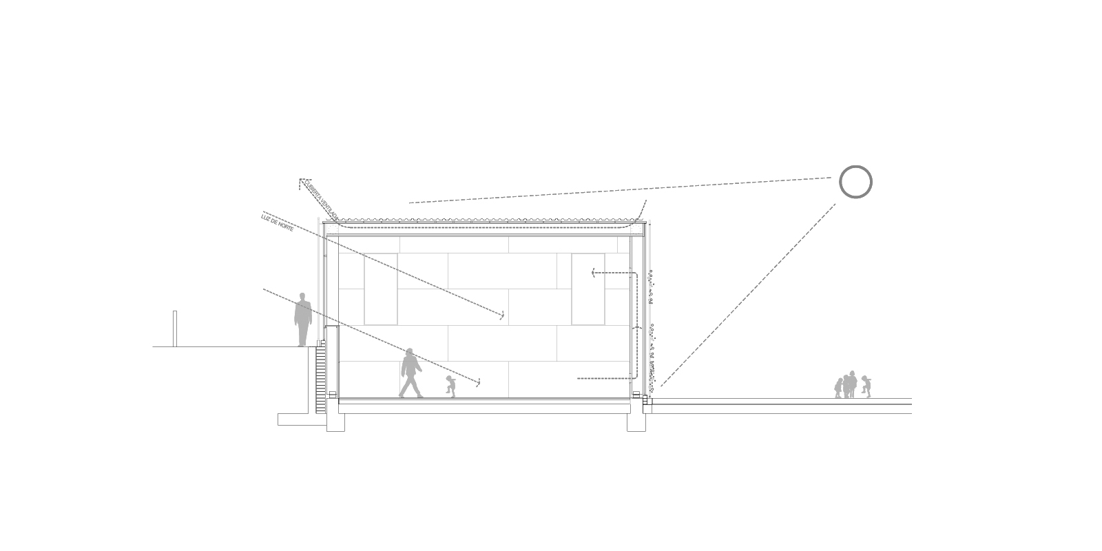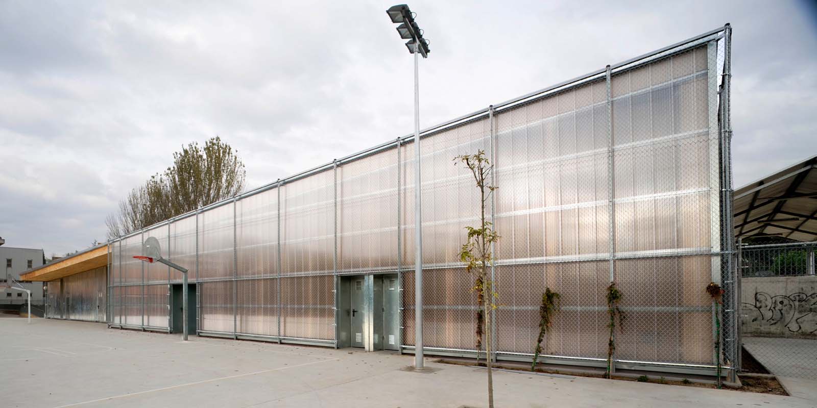 Este prisma se ha adosado al muro de contención de la rampa para no hacer sombra sobre la pista (ahora desplazada de su posición inicial), y permitir una posible gestión de fin de semana independiente respeto el colegio.